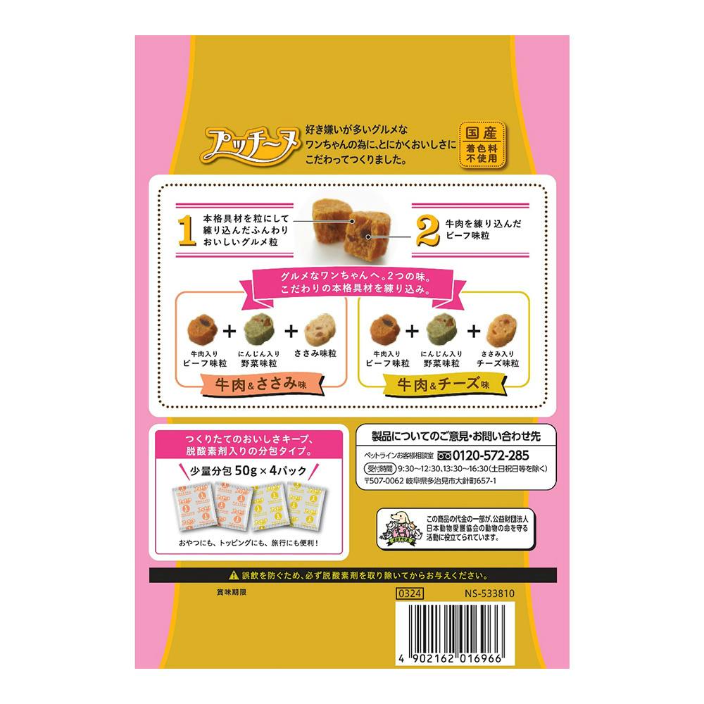 ●チーズ味:牛肉入りビーフ味粒+にんじん入り野菜味粒+ささみ入りチーズ味粒●ささみ味:牛肉入りビーフ味粒+にんじん入り野菜味粒+ささみ味粒