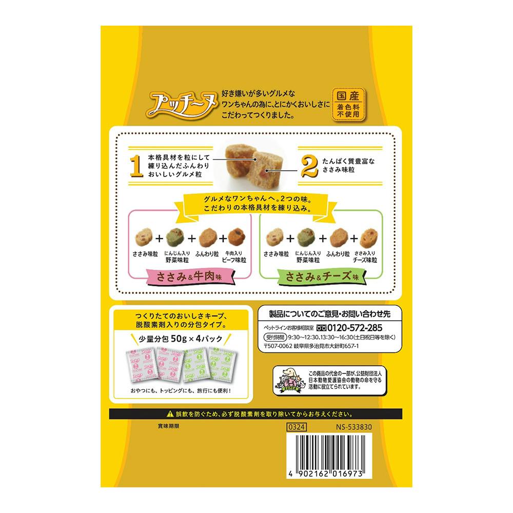 ●ビーフ味:ささみ味粒+にんじん入り野菜味粒+ふんわり粒+牛肉入りビーフ味粒●チーズ味:ささみ味粒+にんじん入り野菜味粒+ふんわり粒+ささみ入りチーズ味粒