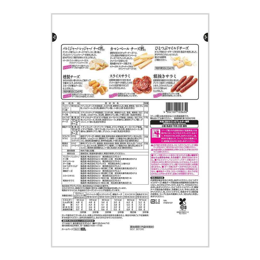 パルミジャーノ・レッジャーノチーズ鱈:20g、カマンベールチーズ鱈:21g、ひとつぶマイルドチーズ:17g、燻製チーズ:15g、スライスサラミ:20g、粗挽きサラミ:22g