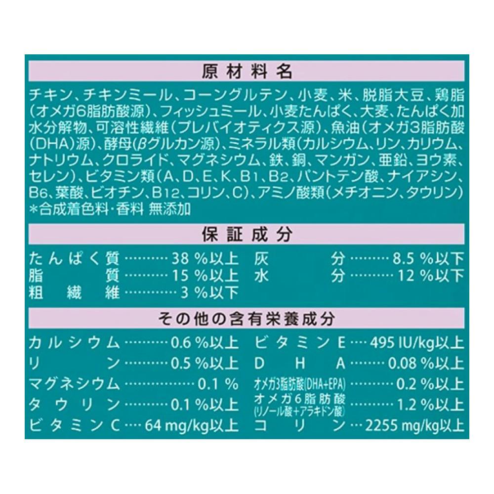 チキン、小麦、コーングルテン、小麦グルテン、鶏脂、米、たんぱく加水分解物、チコリ(プレバイオティクス源)、魚油(DHA、EPA源)、ツナパウダー、ミネラル類(カルシウム、リン、カリウム、ナトリウム、クロライド、鉄、銅、マンガン、その他