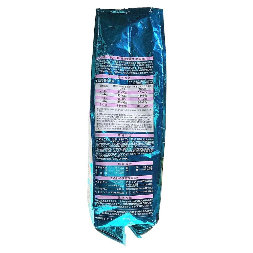 チキン、チキンミール、コーングルテン、小麦、米、脱脂大豆、食物繊維(ビートパルプ、ライスファイバー、セルロース)、鶏脂(オメガ6脂肪酸源)、小麦たんぱく、チコリ(オリゴ糖源)、大麦、たんぱく加水分解物、その他
