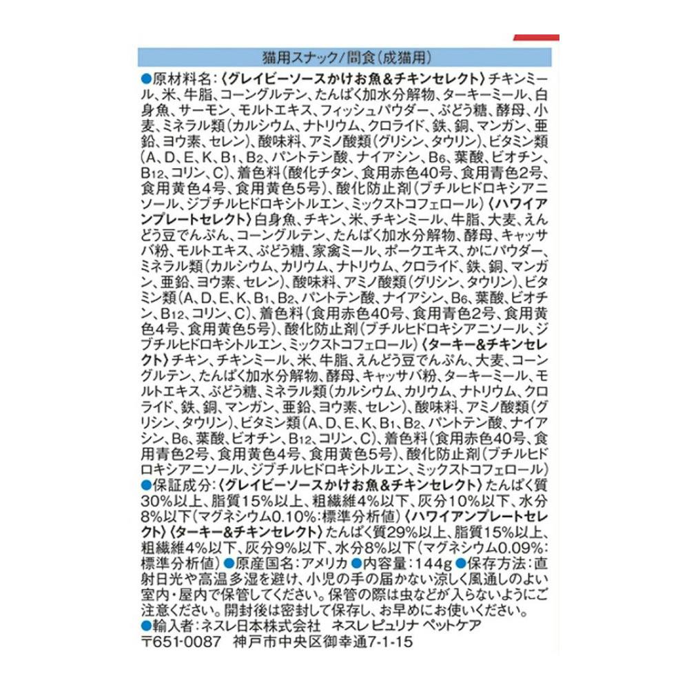<グレイビーソースかけお魚&チキンセレクト>チキンミール、米、牛脂、コーングルテン、たんぱく加水分解物、ターキーミール、白身魚、サーモン、モルトエキス、フィッシュパウダー、ぶどう糖、酵母、小麦、ミネラル類(カルシウム、ナトリウム、クロライド、鉄、銅、マンガ