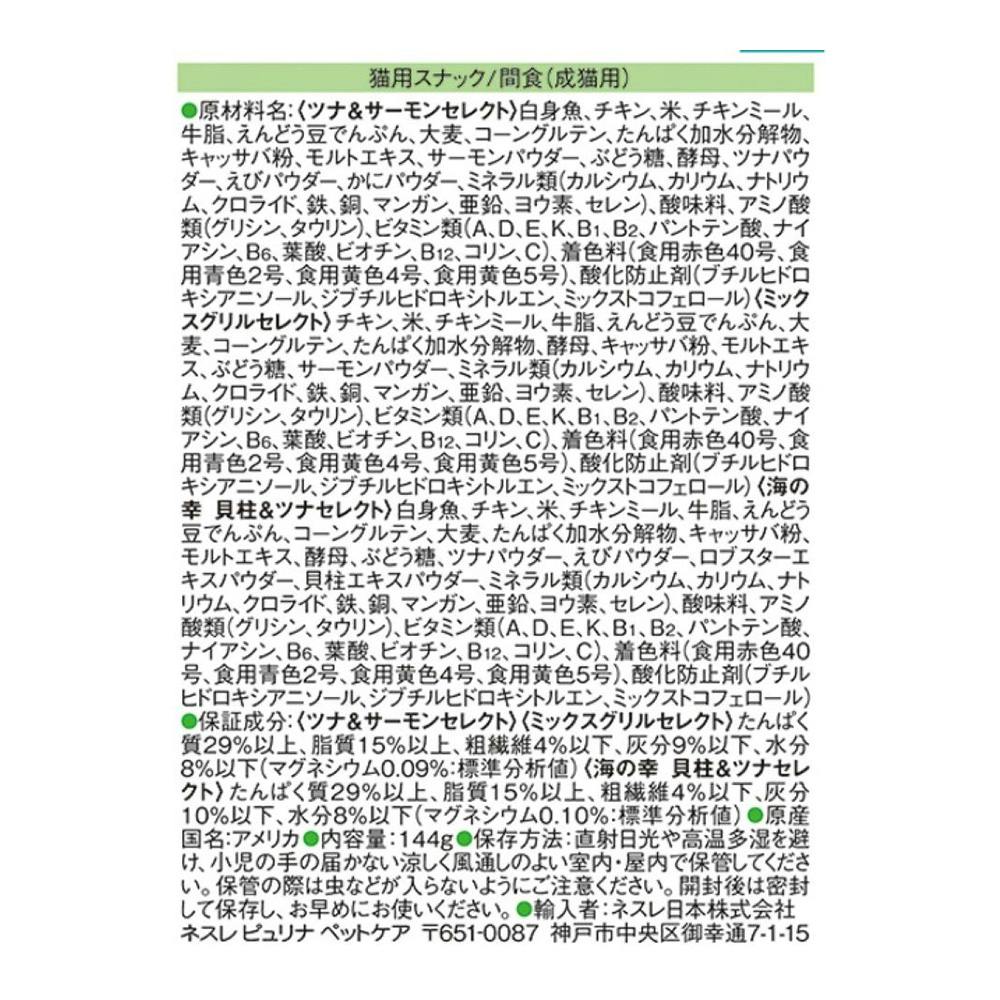 <ツナ&サーモンセレクト>白身魚、チキン、米、チキンミール、牛脂、えんどう豆でんぷん、大麦、コーングルテン、たんぱく加水分解物、キャッサバ粉、モルトエキス、サーモンパウダー、ぶどう糖、酵母、ツナパウダー、えびパウダー、かにパウダー、ミネラル類(カルシウム、