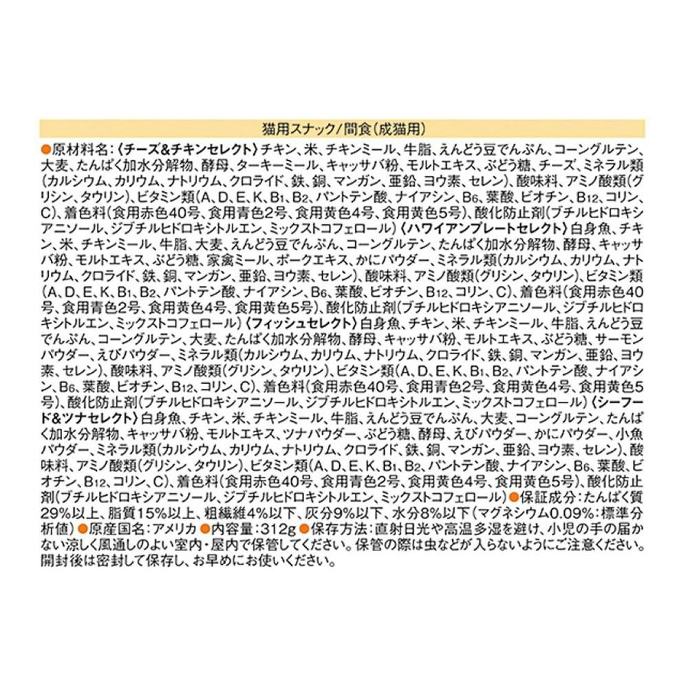 【チーズ&チキンセレクト】チキン、米、チキンミール、牛脂、えんどう豆でんぷん、コーングルテン、大麦、たんぱく加水分解物、酵母、ターキーミール、キャッサバ粉、モルトエキス、ぶどう糖、チーズ、ミネラル類(カルシウム、カリウム、ナトリウム、クロライド、鉄、銅、マ