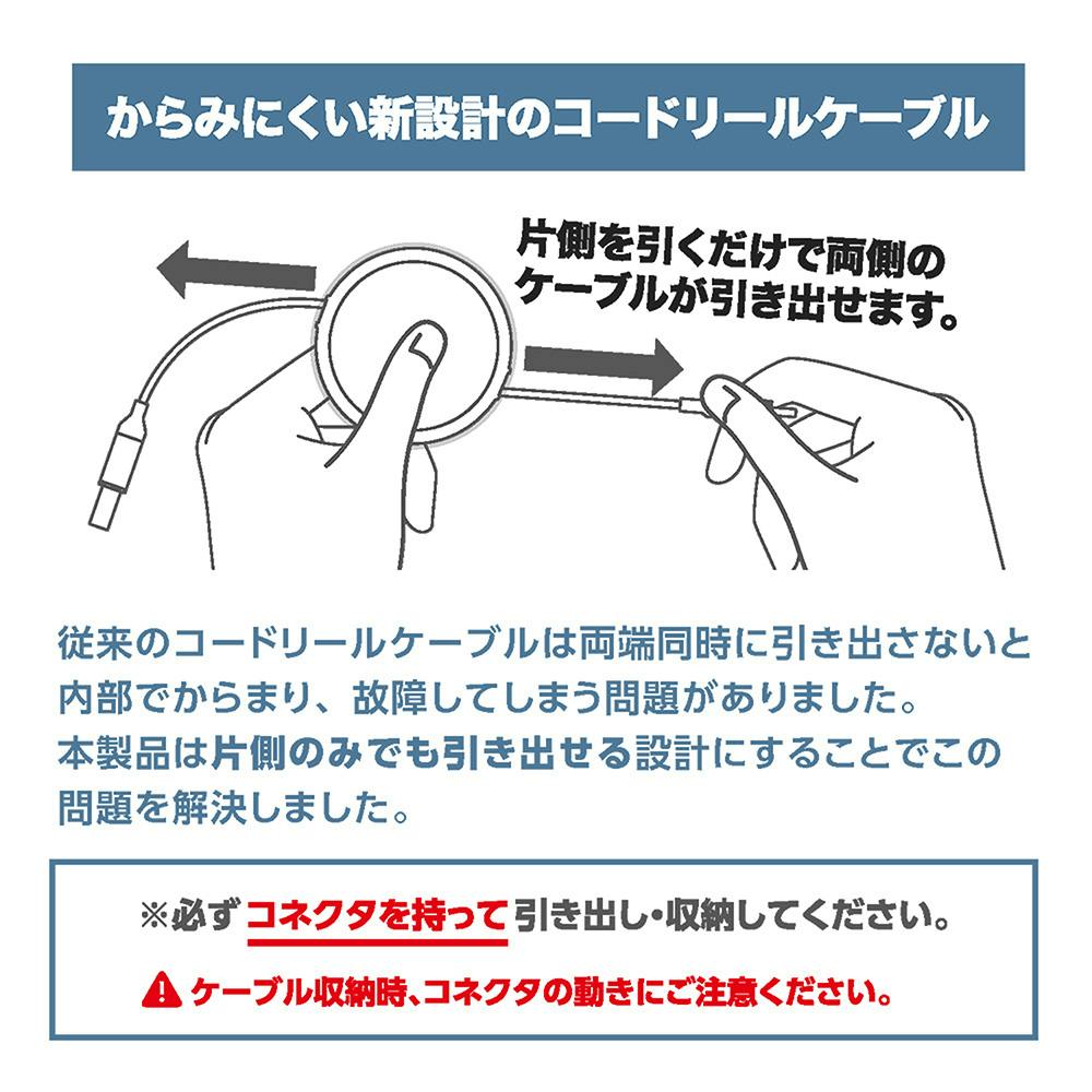 柔らかくて絡みにくいコードリードケーブル。絡みにくい新設計リール採用。ケーブル収納時もしっかり守るシェル構造。USB充電器で安全に充電可能な56K抵抗搭載。