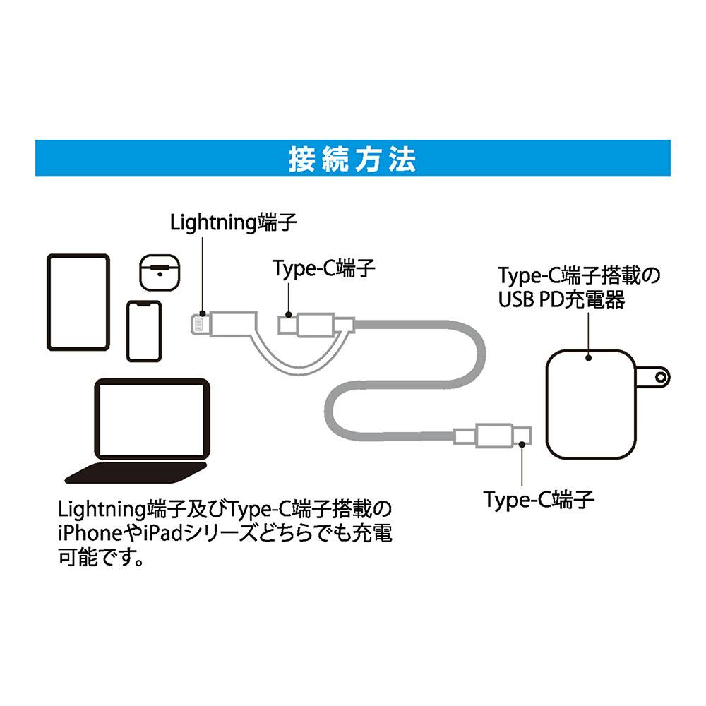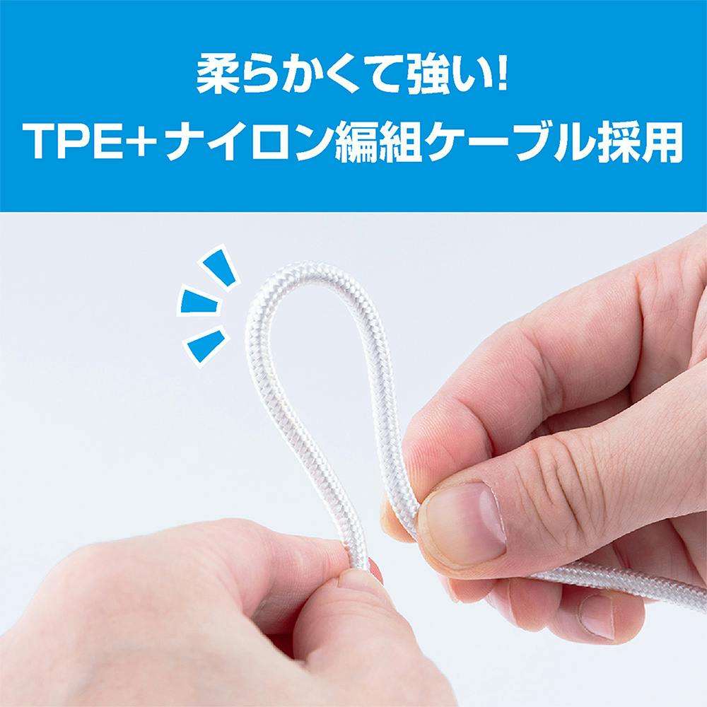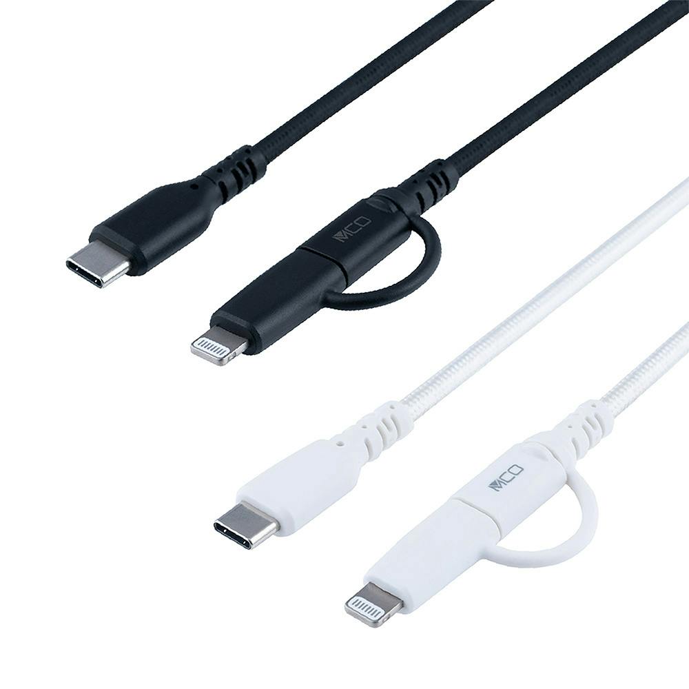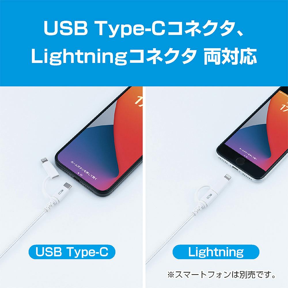 柔らかくて強いナイロン+TPE採用。ライトニングとType-C端子の2in1タイプ。USB PD60W高速充電対応。便利なケーブルバンド付き。OSアップデート後も安心のMFi認証品。取り回しやすい柔らかいケーブル採用。被覆破れに強いナイロン編組採用。