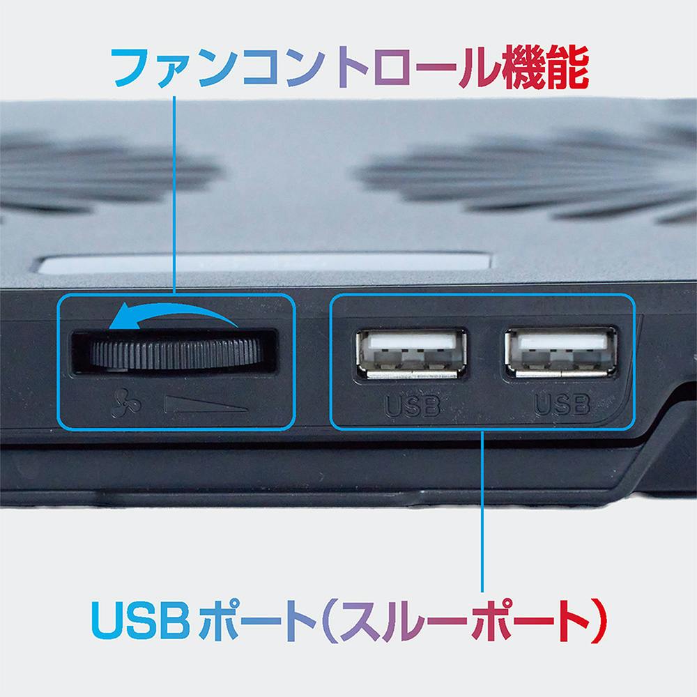 ●ファンコントローラー搭載で風量調整可能。●クーリングパッドモード+ノートスタンドモードの2Way。●USBポート(スルーポート)搭載でノートPCのUSBポートをふさぎません。●ダブルストッパー搭載でノートPCをしっかり支えます。
