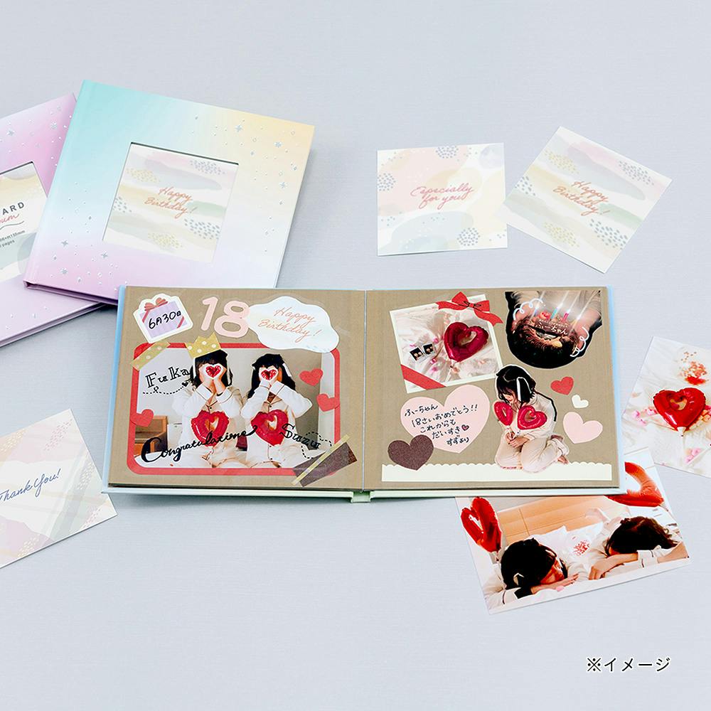 大切なあの人へ、特別なプレゼント。貼り直しができるフリー台紙。表紙を彩る、シーンに合わせて選べるギフトカード付き。ギフトカードは自由にカットして、デコレーションにも使えます。