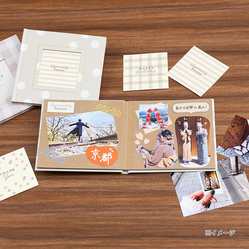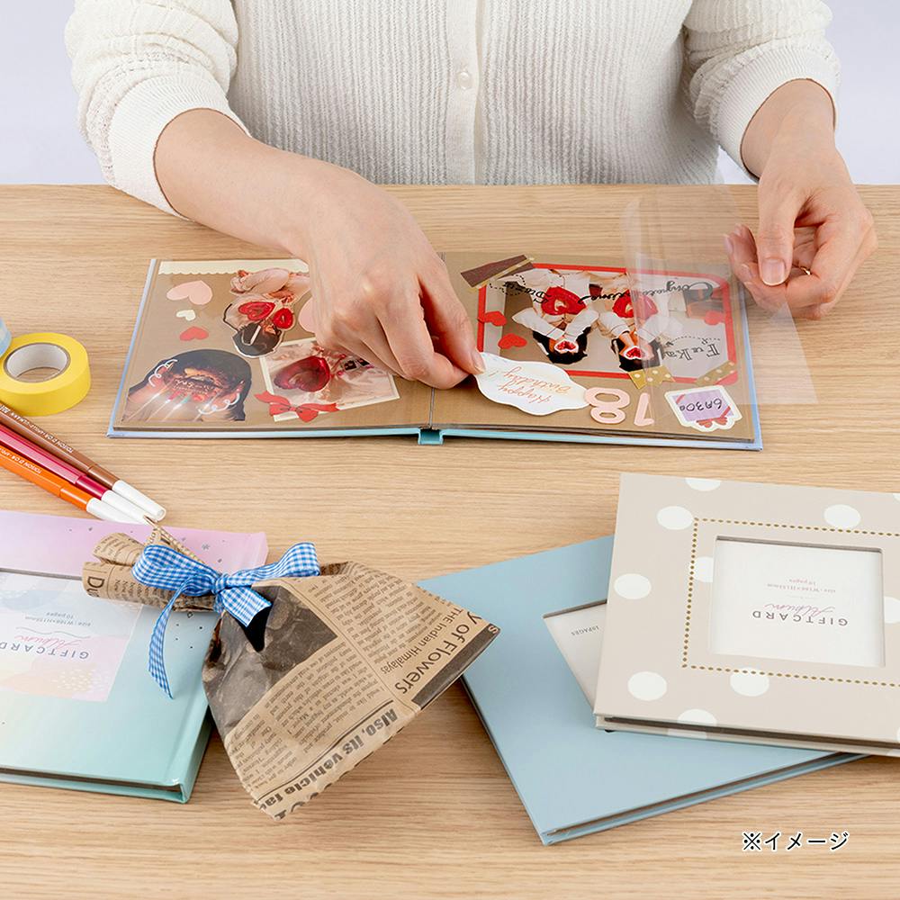 大切なあの人へ、特別なプレゼント。貼り直しができるフリー台紙。表紙を彩る、シーンに合わせて選べるギフトカード付き。ギフトカードは自由にカットして、デコレーションにも使えます。