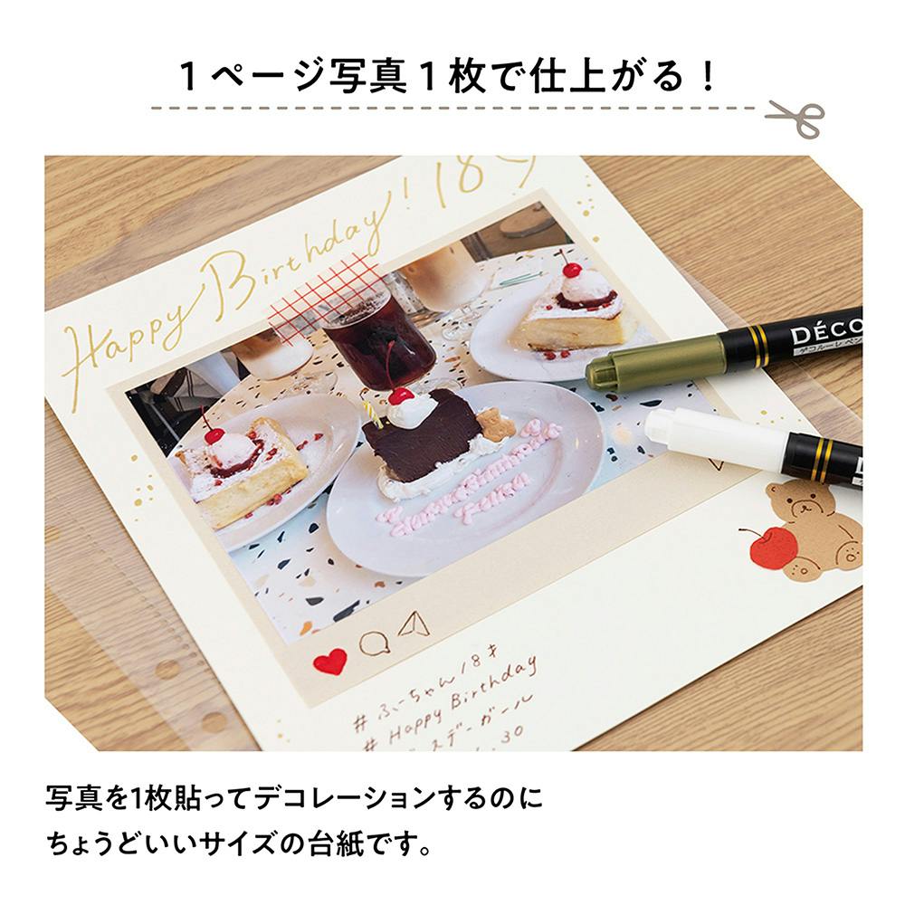 手軽に作れる、使える、贈れる。1ページ写真1枚で仕上がるバインダー式のスクラップアルバムです。高透明ポケットに、しっかりとした厚みのカード台紙が1枚ずつ入っています。カードをポケットから取り出して作ることができるので複数人での同時作業が可能です。