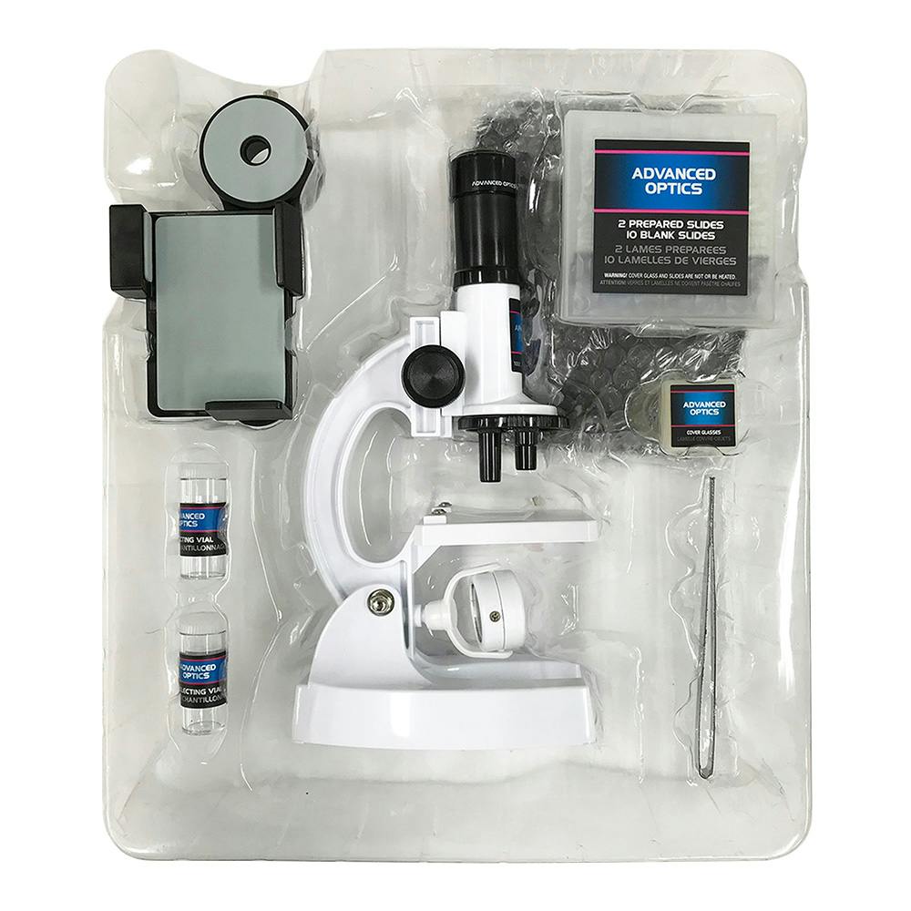 顕微鏡台座×1、スマートフォンアダプター×1、試料ケース×2、ピンセット×1、プレパラート標本付×1、スライドグラス×10、カバーグラス×12、記録用ラベル×12、取扱説明書×1