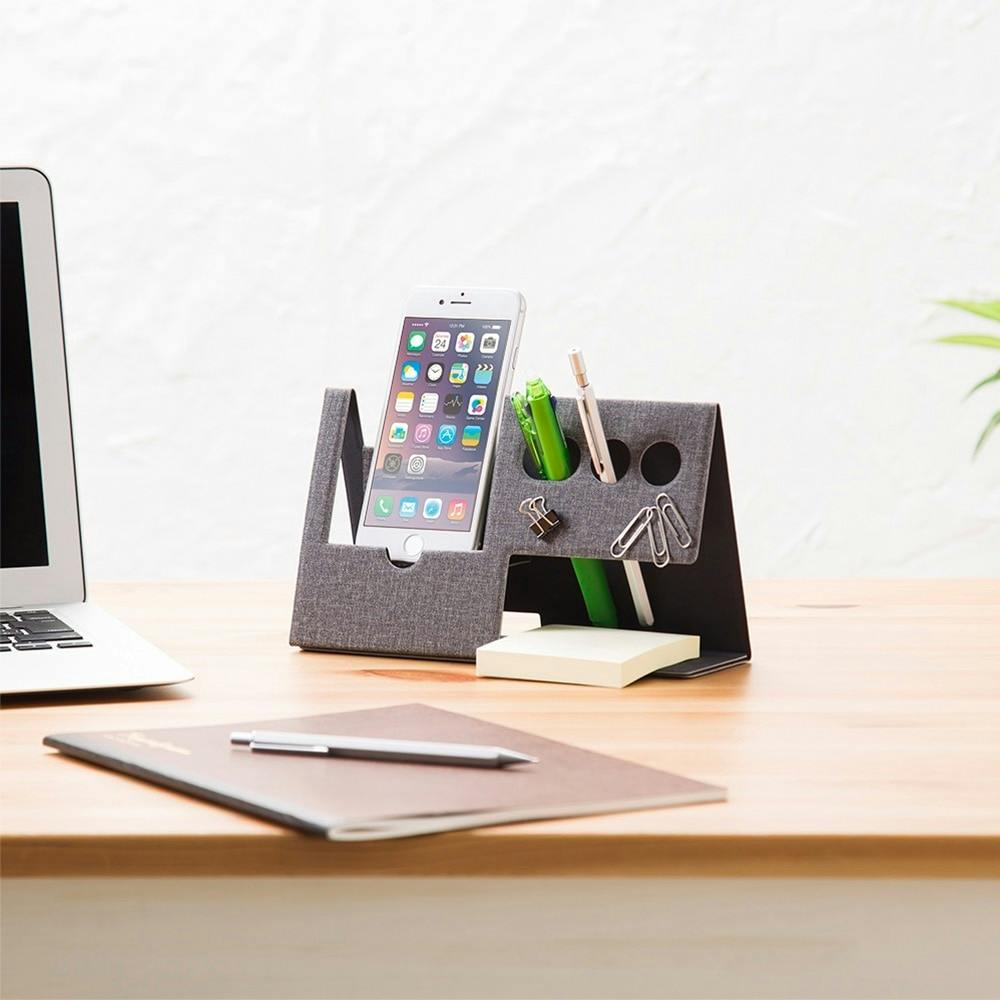 ●折りたたむと持ち運びできるコンパクトサイズ。●充電しながらスマホが置ける前面にはペンが立てられる三つの丸穴。●クリップなどがくっつくマグネット内蔵。●付箋などが置けるフリースペース。●ori-pact/オリパクト。