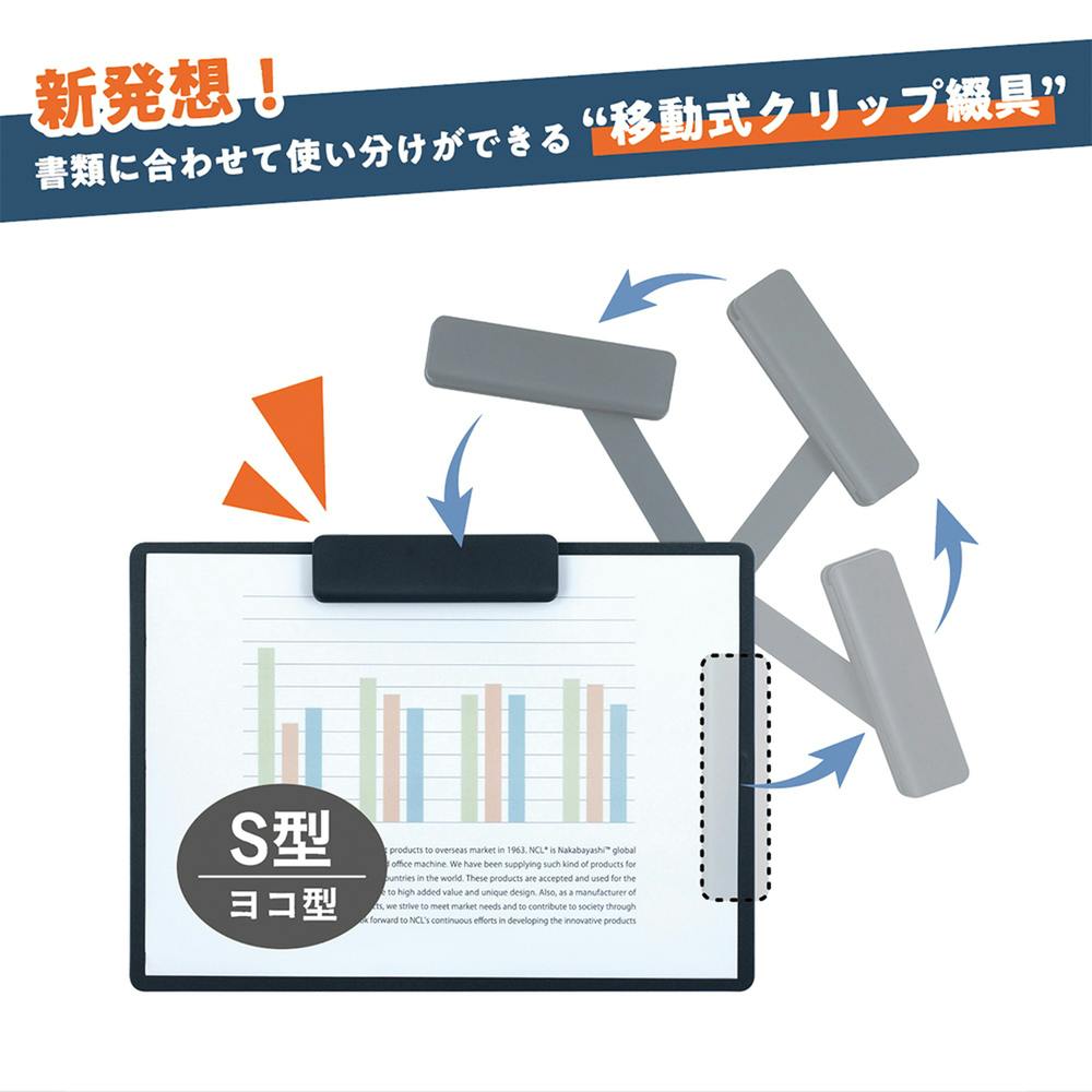クリップを回してS型とE型をかんたんシフト!移動式のクリップがついたタテヨコ兼用のクリップボードです。書類に合わせてS型とE型を使い分けることができます。