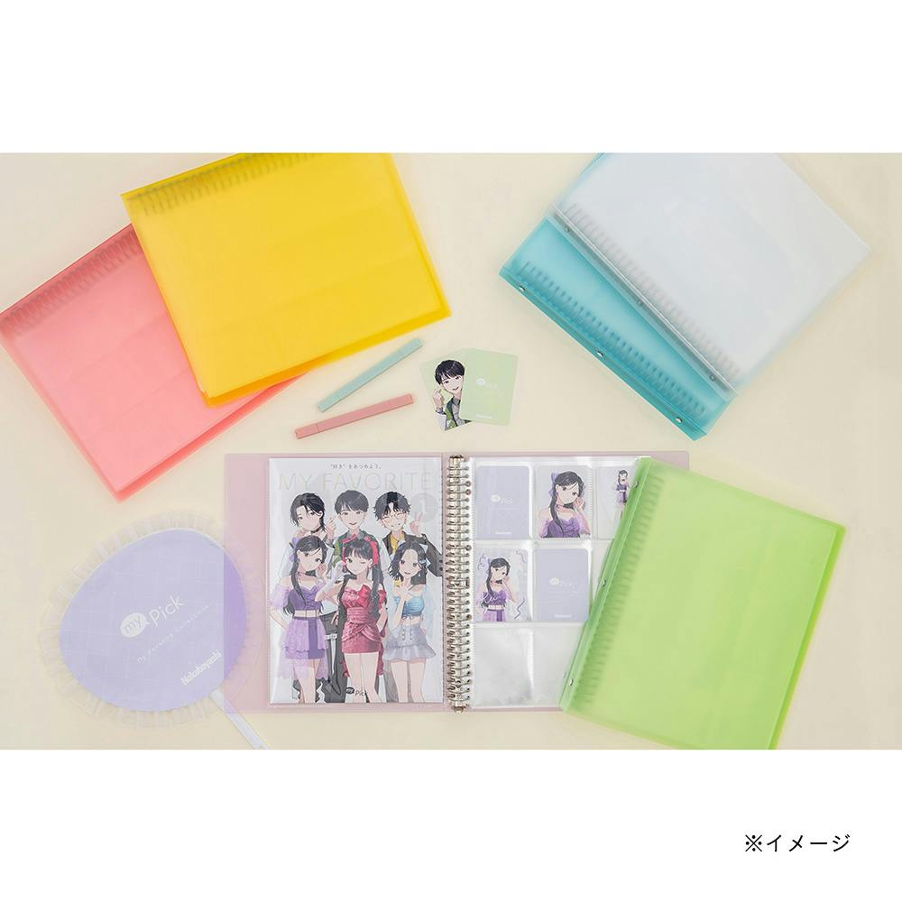 “好き”をあつめよう。クリア表紙で、表紙を自分好みにカスタマイズすることができます。スリーブに入れたまま収納できる大きめポケット仕様。推しのメンバーカラーや、キャラクターのテーマカラーにあわせて選べるカラフルな6色展開。