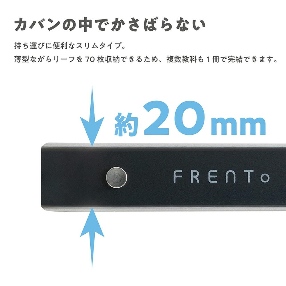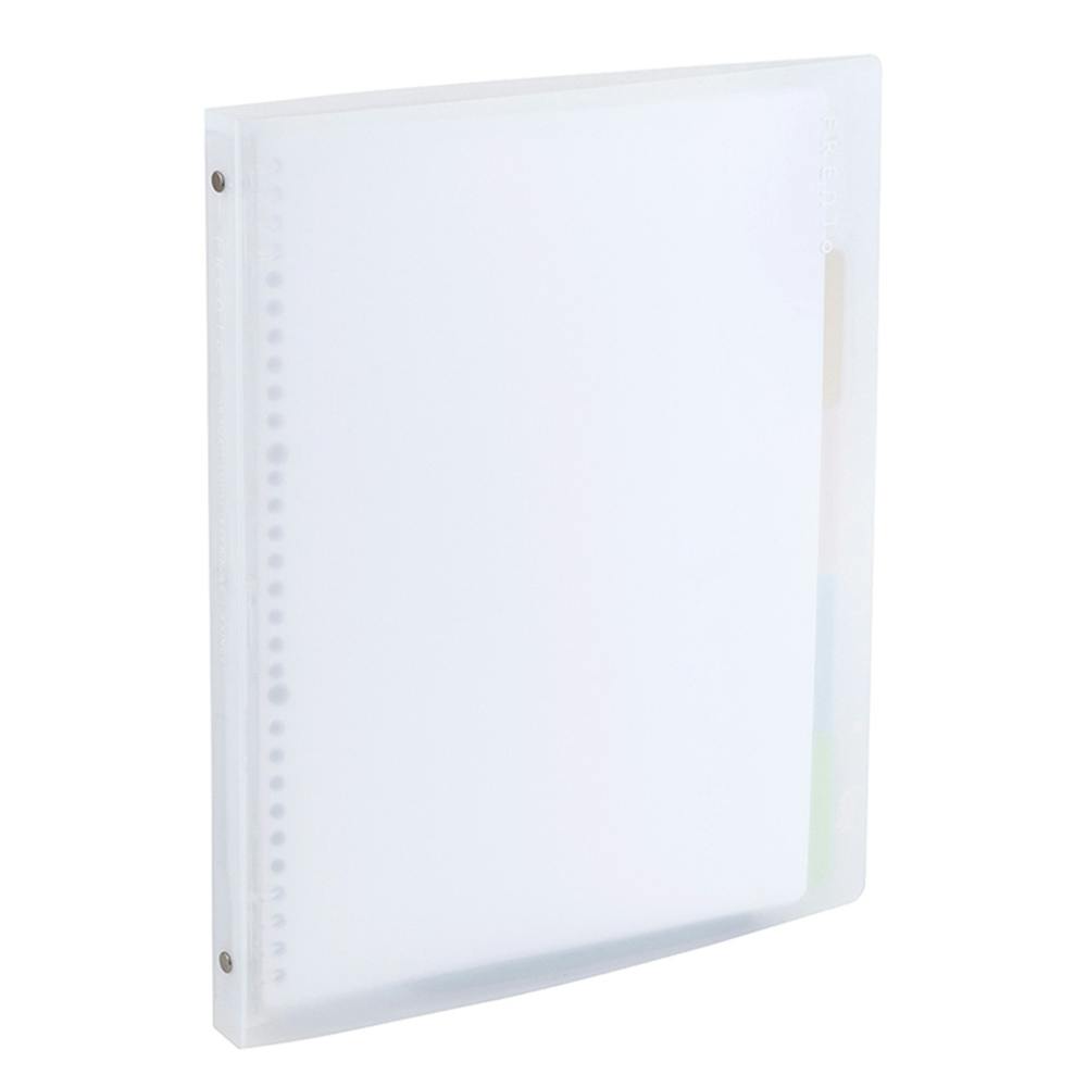 リングが手にふれないため、ページの端までストレスなく書き込めます。科目や項目を分けられるインデックスシート5枚+未使用のルーズリーフなどを入れられるフリーポケット1枚が付属しています。カバンの大きさや用途に合わせて選べる3サイズをラインアップ。