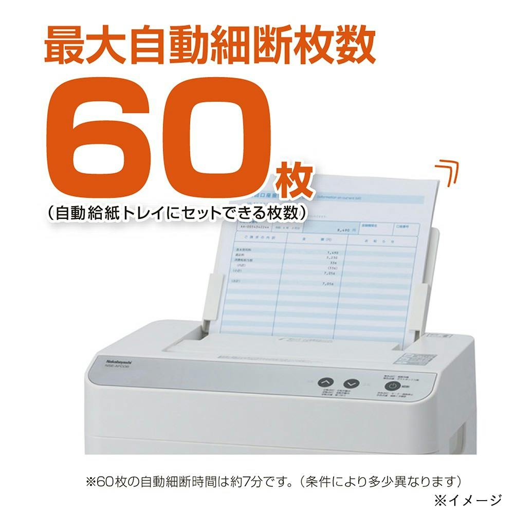 60枚を自動細断。自動細断の途中でも手差し細断が可能(1枚まで)。過負荷検知後のオートリバース(自動逆転)機能付き。