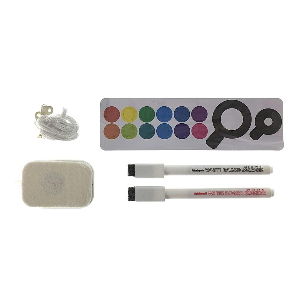 イレーザー付マーカー0.8mm(赤・黒各1本)、イレーザー(1個)、吊り紐(1本)、吊り下げ金具(2個)、ネジ(2本)、丸マグネットシート(12個セット)、虫眼鏡マグネットシート(2個セット)
