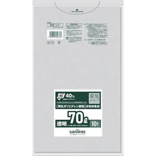 【CAINZ-DASH】日本サニパック W-73環境クラブ70L透明 10枚 W-73-CL【別送品】