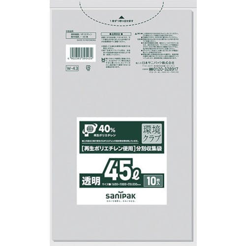 【CAINZ-DASH】日本サニパック W-43環境クラブ45L透明 10枚 W-43-CL【別送品】