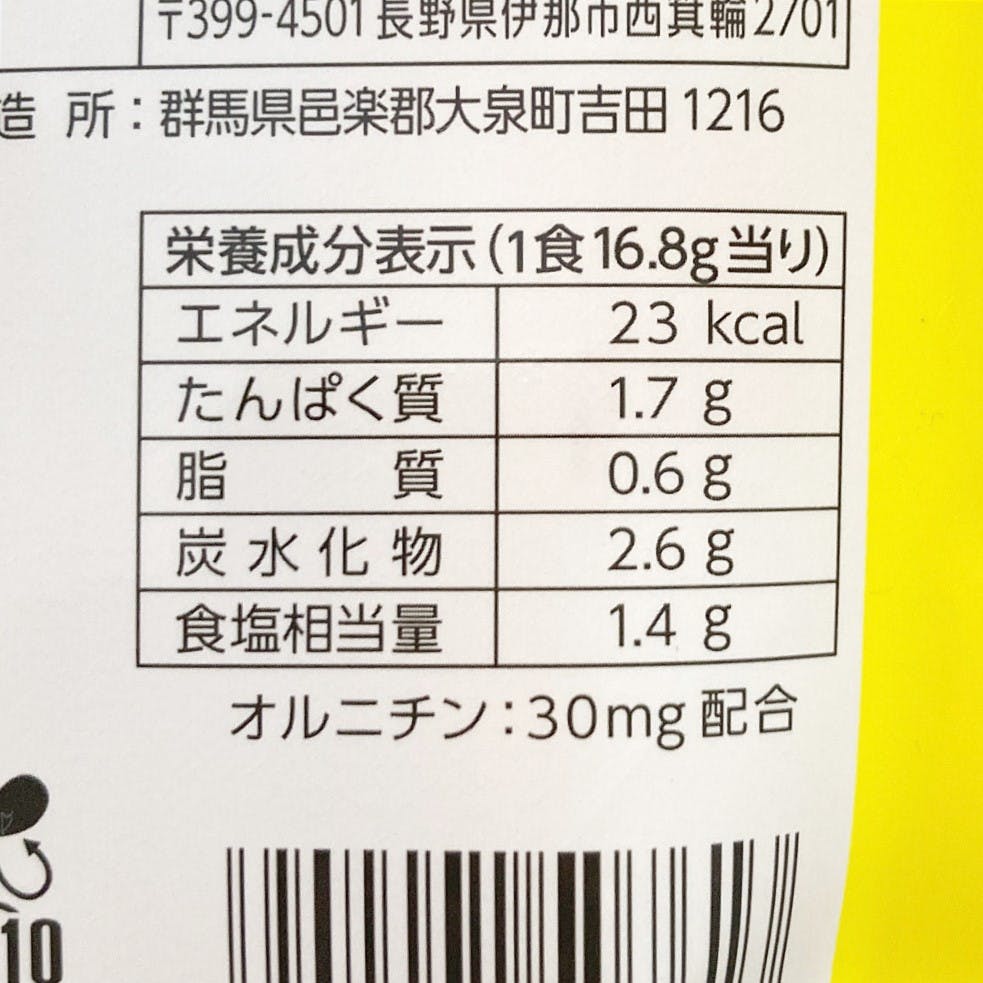 栄養成分表示(1食16.8g当り)/エネルギー:23kcal、たんぱく質:1.7g、脂質:0.6g、炭水化物:2.6g、食塩相当量:1.4g、オルニチン:30mg配合