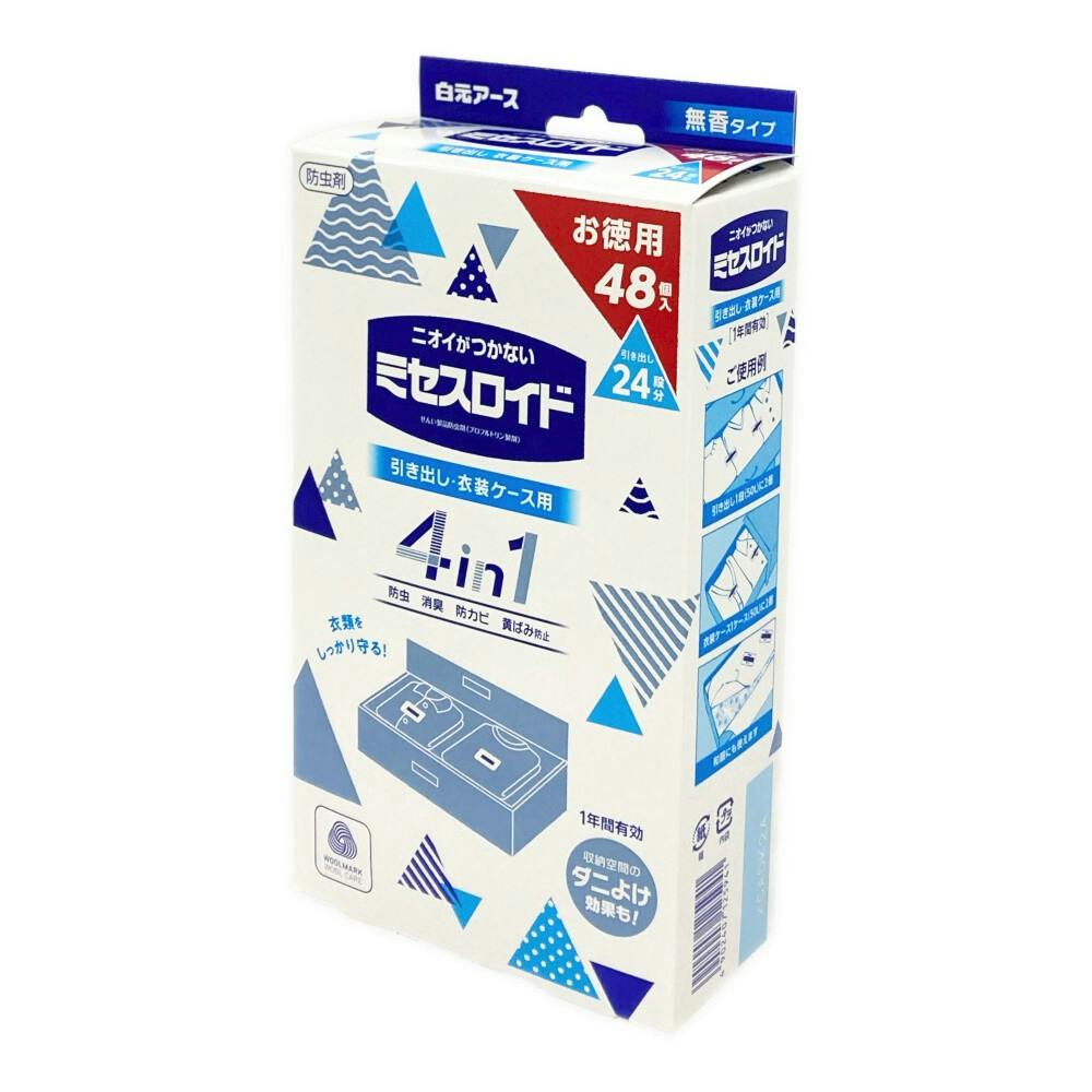 ●収納空間のダニよけ効果も! ●衣類をしっかり守る4in1/ニオイがつかない防虫成分、消臭成分配合、防カビ剤配合、黄ばみ防止成分配合 ●ミセスロイドは、他の防虫剤と一緒に使えます ●お徳用48個入/引き出し24段分