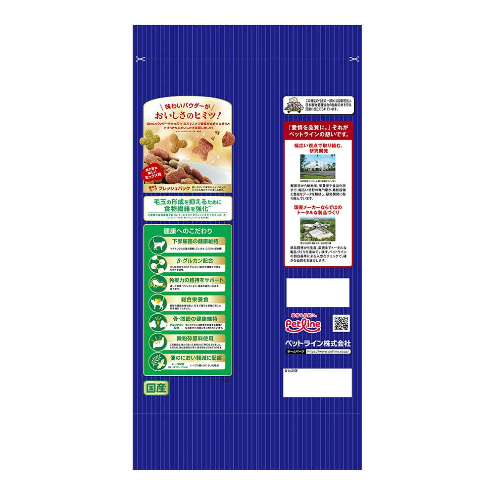 まぐろ味をベースに愛猫の大好きな味をミックス。β-グルカン・グルコサミン・ハーブを配合。味わいパウダーをまぶして、とびっきりのおいしさ。2種類の食物繊維を配合して毛玉の形成を抑制。