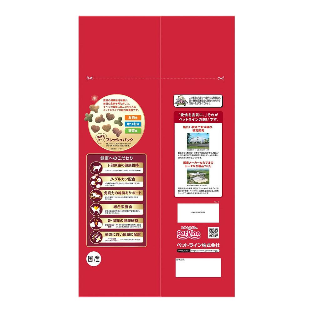 毎日の食事を、すべての猫ちゃんに喜んでもらえるよう考えたミックスタイプのキャットフード。独自の研究・改良の結果、とびっきりのおいしさを実現しています。猫ちゃんの健康維持に配慮してマグネシウムを調整。さらにβ-グルカン、グルコサミン、ハーブを配合。