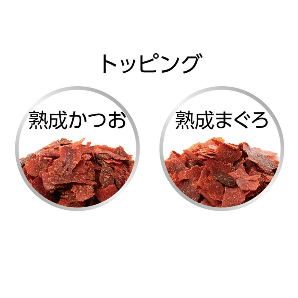 お肉とお魚味の粒に、厳選したトッピングを添えて飽きのこない味わいに仕上げました。トッピングされた2種のアルミ蒸着分包が275g×4パック入りで美味しさをキープ。酸化を防ぎ風味を保つ脱酸素剤入り。