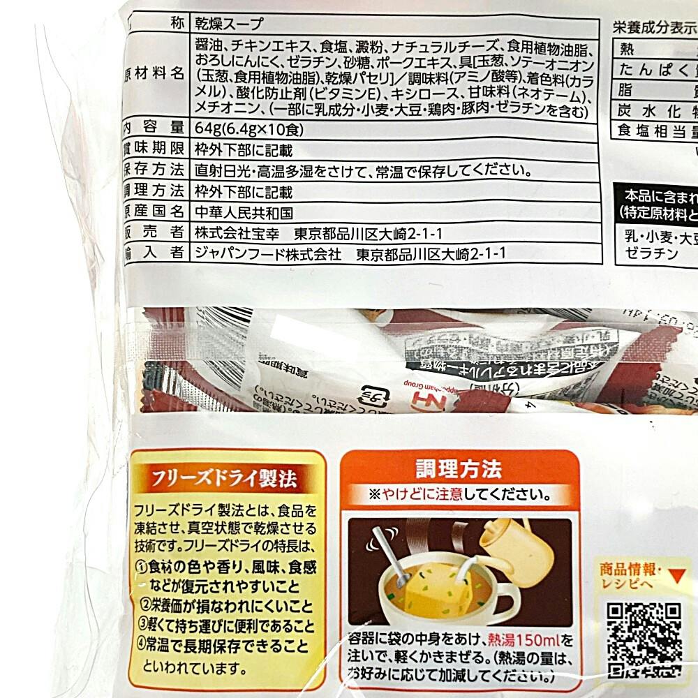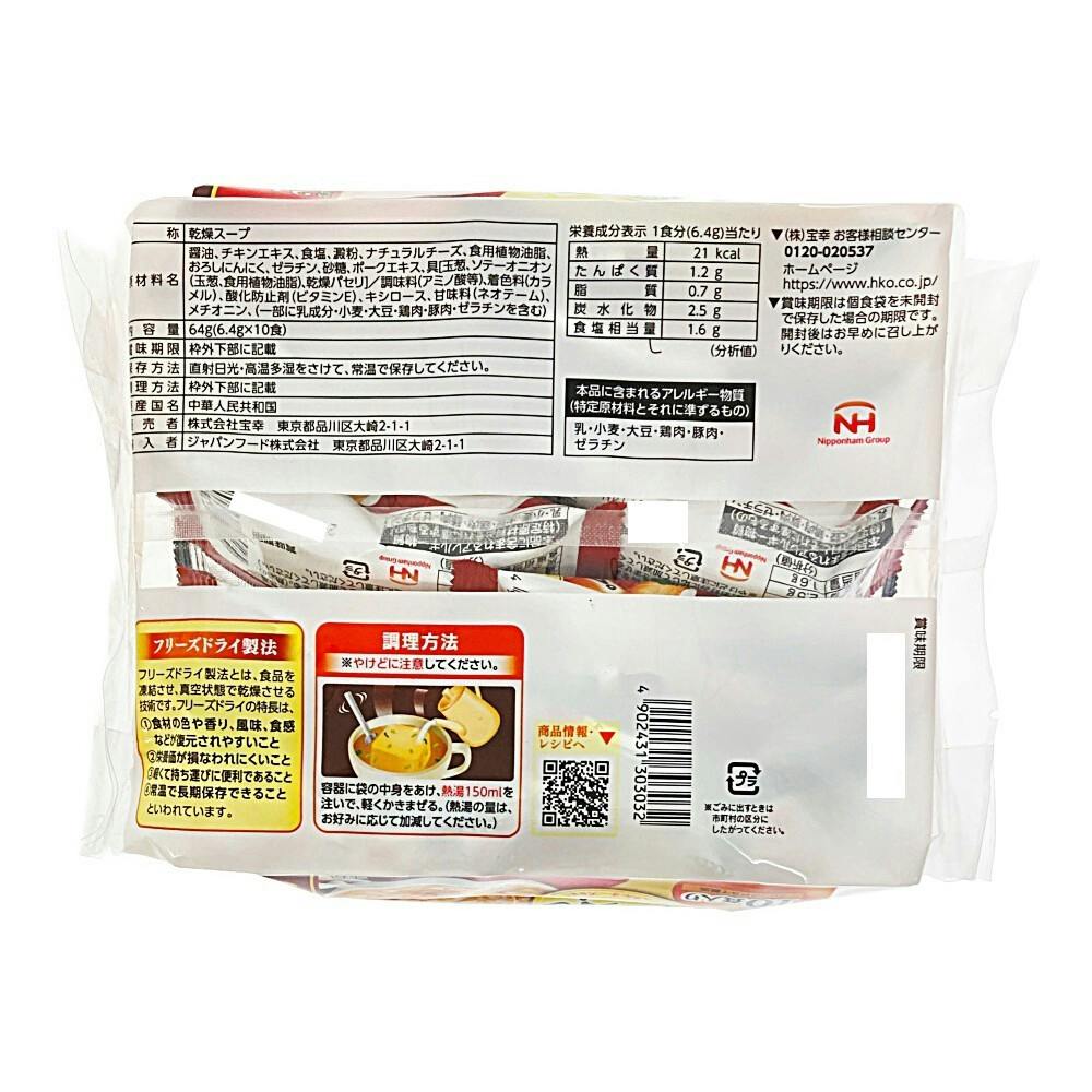 ●たまねぎたっぷり、ナチュラルチーズ仕立て ●フリーズドライ製法 ●お湯を注ぐだけ ●調理方法※やけどに注意してください/容器の中に袋の中身をあけ、熱湯150mLを注いで、軽くかき混ぜる。(熱湯の量は、お好みに応じて加減してください)