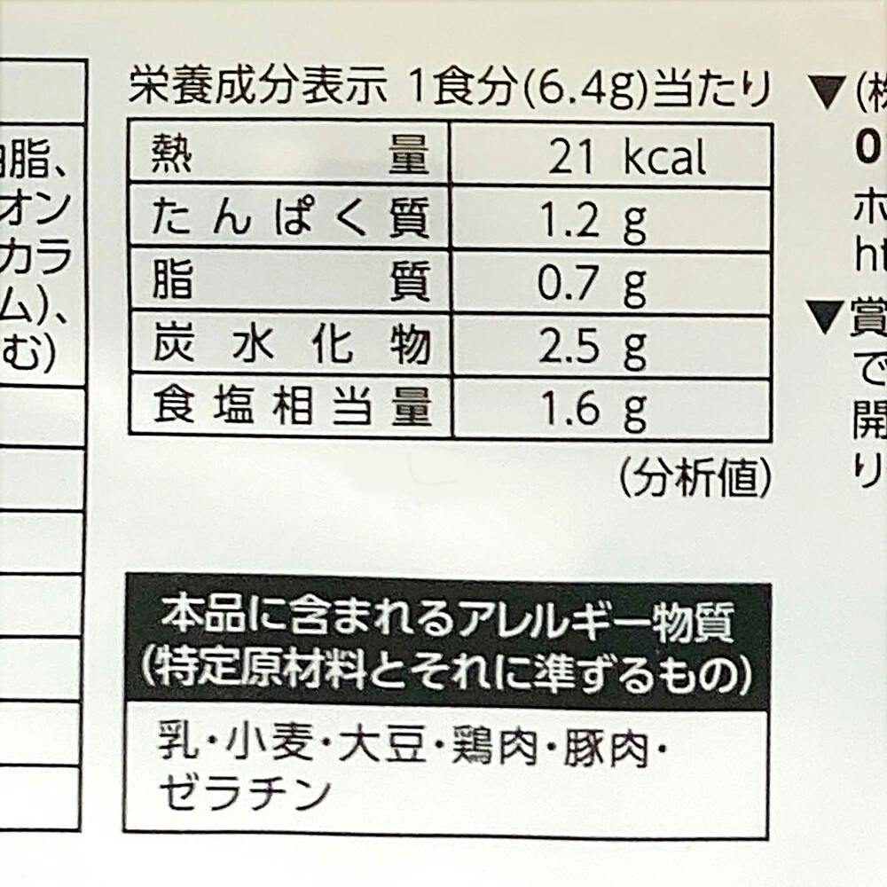 栄養成分表示・1食分(6.4g)当たり/熱量:21kcal、たんぱく質:1.2g、脂質:0.7g、炭水化物:2.5g、食塩相当量:1.6g (分析値)