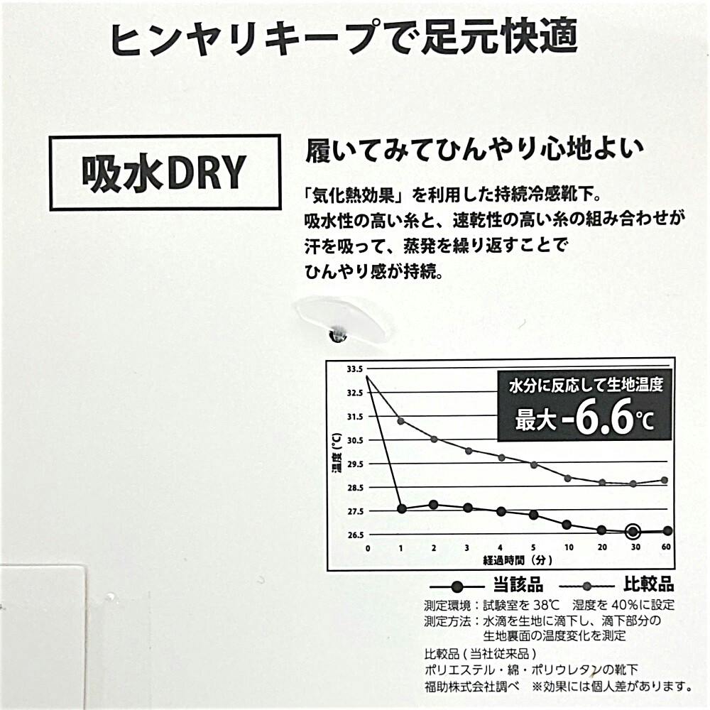 ●ヒンヤリキープで足元快適 ●吸水DRY、履いてみてひんやり心地よい/「気化熱効果」を利用した持続冷感靴下。吸水性の高い糸と、速乾性の高い糸の組み合わせが汗を吸って、蒸発を繰り返すことでひんやり感が持続。