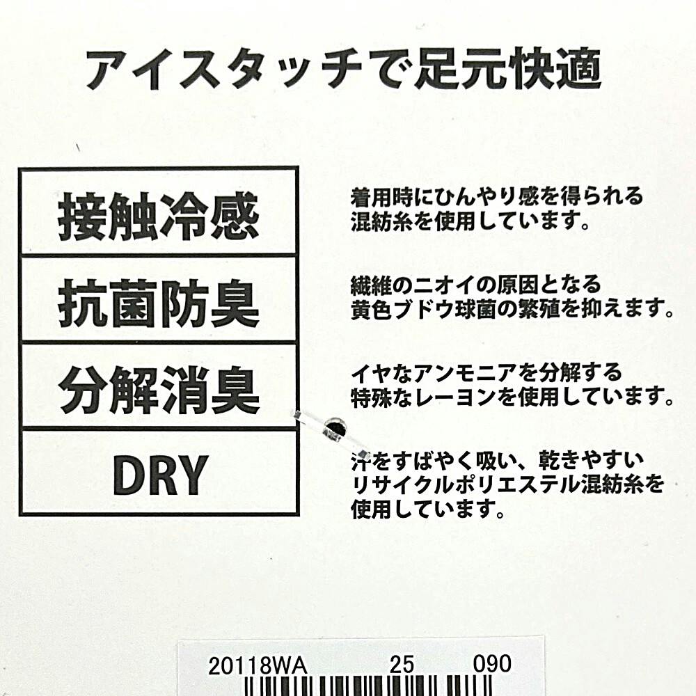 ●アイスタッチで足元快適 ●接触冷感/着用時にひんやり感を得られる混紡糸を使用しています ●抗菌防臭/繊維のニオイの原因となる黄色ブドウ球菌の繁殖を抑えます ●分解消臭/イヤなアンモニアを分解する特殊なレーヨンを使用しています など