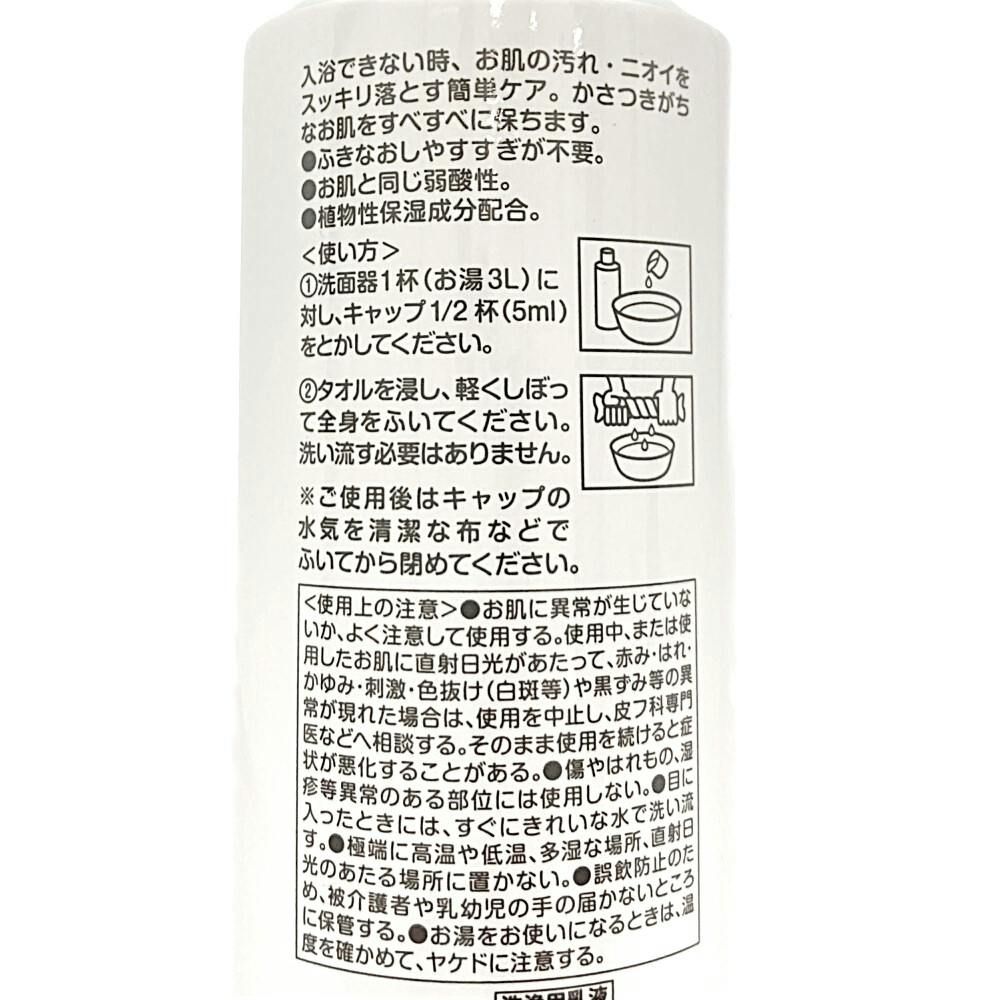 1.洗面器1杯(お湯3L)に対し、キャップ1/2杯(5mL)をとかしてください 2.タオルを浸し、軽くしぼって全身をふいてください。洗い流す必要はありません ※ご使用後はキャップの水気を清潔な布などでふいてから閉めてください