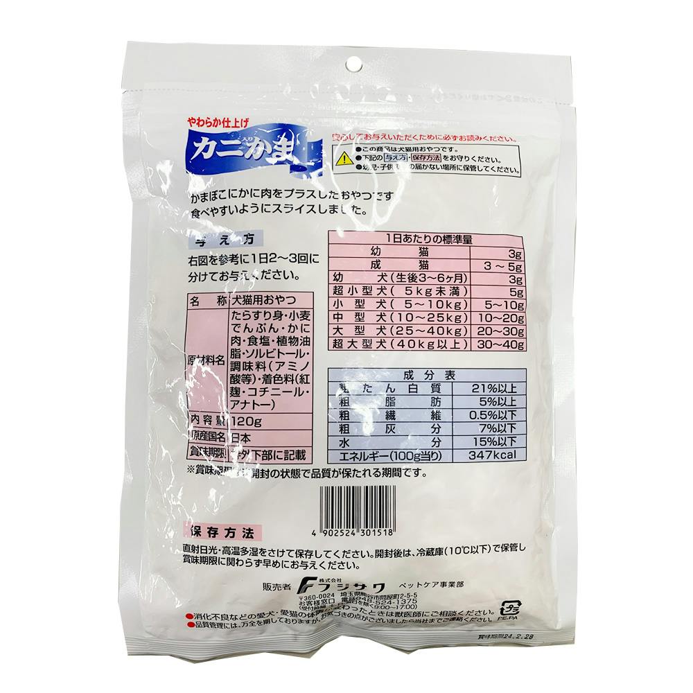 たらすり身、小麦でんぷん、カニ肉、食塩、植物油脂、ソルビトール、調味料(アミノ酸等)、着色料(紅麹、コチニール、アナトー)