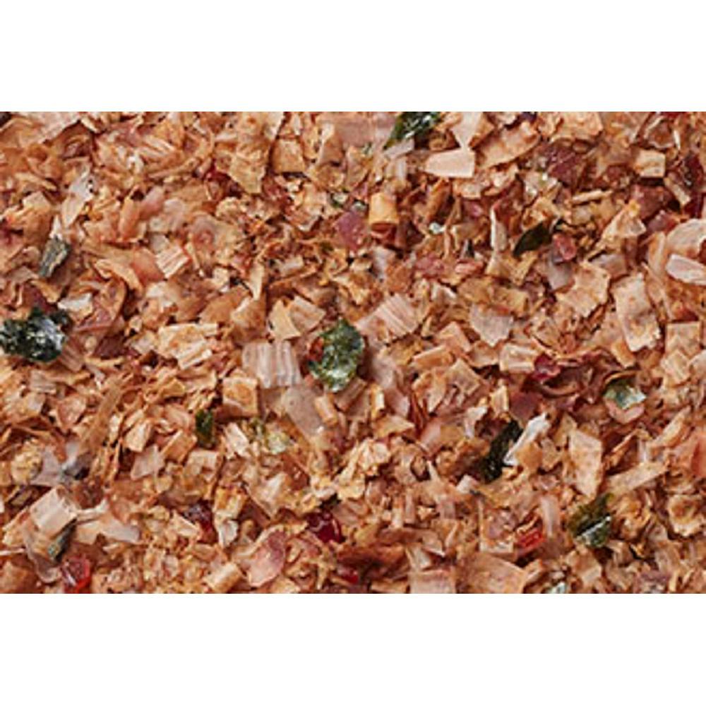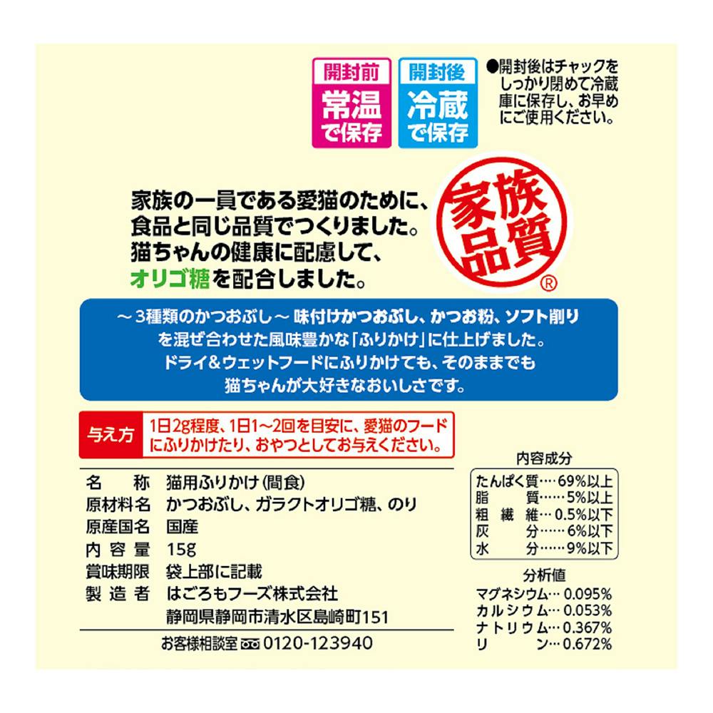 味付けかつおぶし、かつお粉、ソフト削りを混ぜ合わせた風味豊かな「ふりかけ」に仕上げました。ドライ&ウェットフードにふりかけてもそのままでも猫ちゃんが大好きなおいしさです。