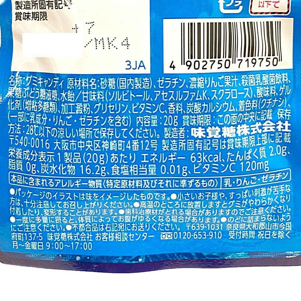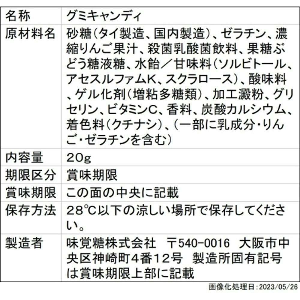 砂糖(国内製造)、ゼラチン、濃縮りんご果汁、殺菌乳酸菌飲料、果糖ぶどう糖液糖、水飴/甘味料(ソルビトール、アセスルファムK、スクラロース)、酸味料、ゲル化剤(増粘多糖類、加工澱粉、グリセリン、ビタミンC、香料、炭酸カルシウム、着色料(クチナシ)、など