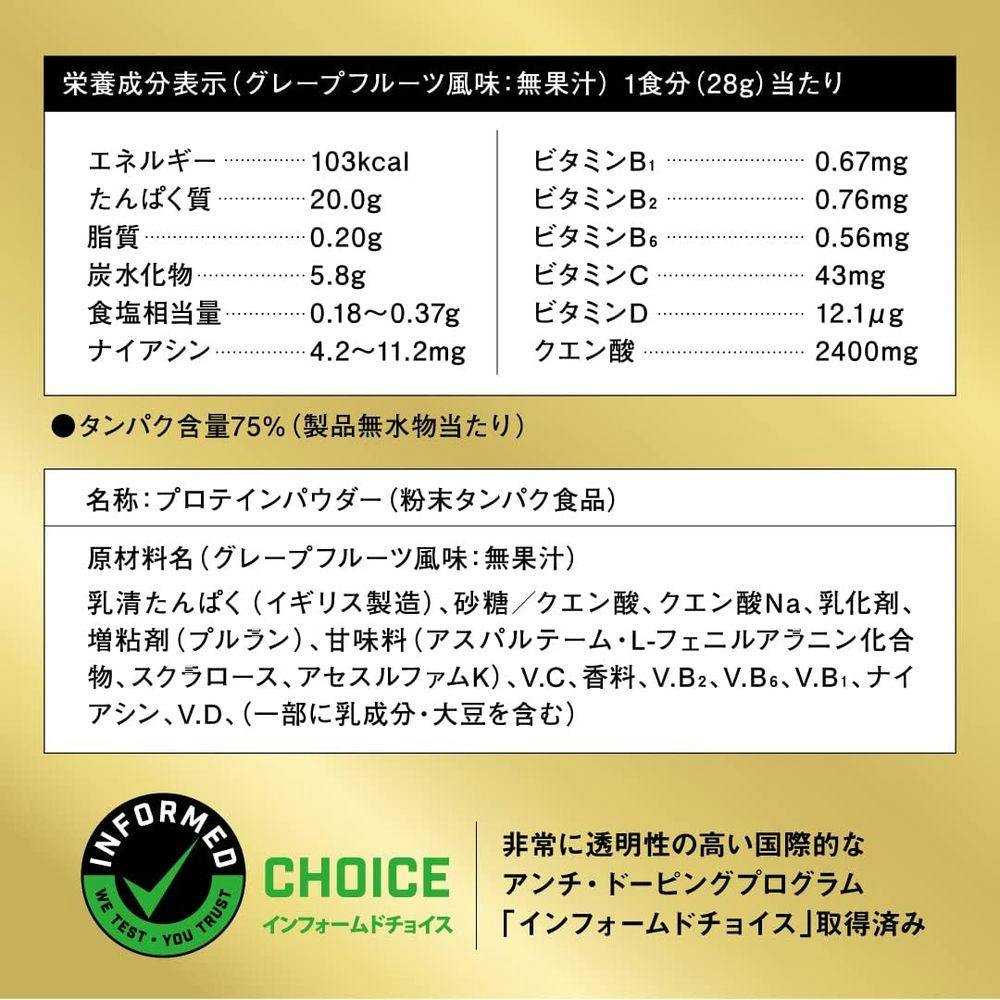乳清たんぱく(イギリス製造)、砂糖/クエン酸、クエン酸Na、乳化剤、増粘剤(プルラン)、甘味料(アスパルテーム・L-フェニルアラニン化合物、スクラロース、アセスルファムK)、V.C、香料、V.B2、V.B6、V.B1、ナイアシン、V.D
