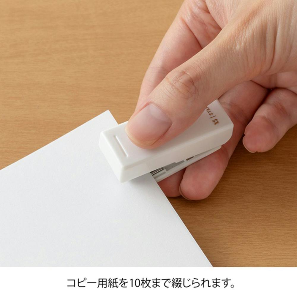 従来の『XSコンパクトホッチキス』をさらに小さくリニューアル。約30%の小型化を実現し、より携帯性を高めました。針外しに便利なリムーバー付き/針の位置を確認できる目印付き/コピー用紙を10枚まで留められるなど、従来の製品と同じ機能を持ち合わせています。