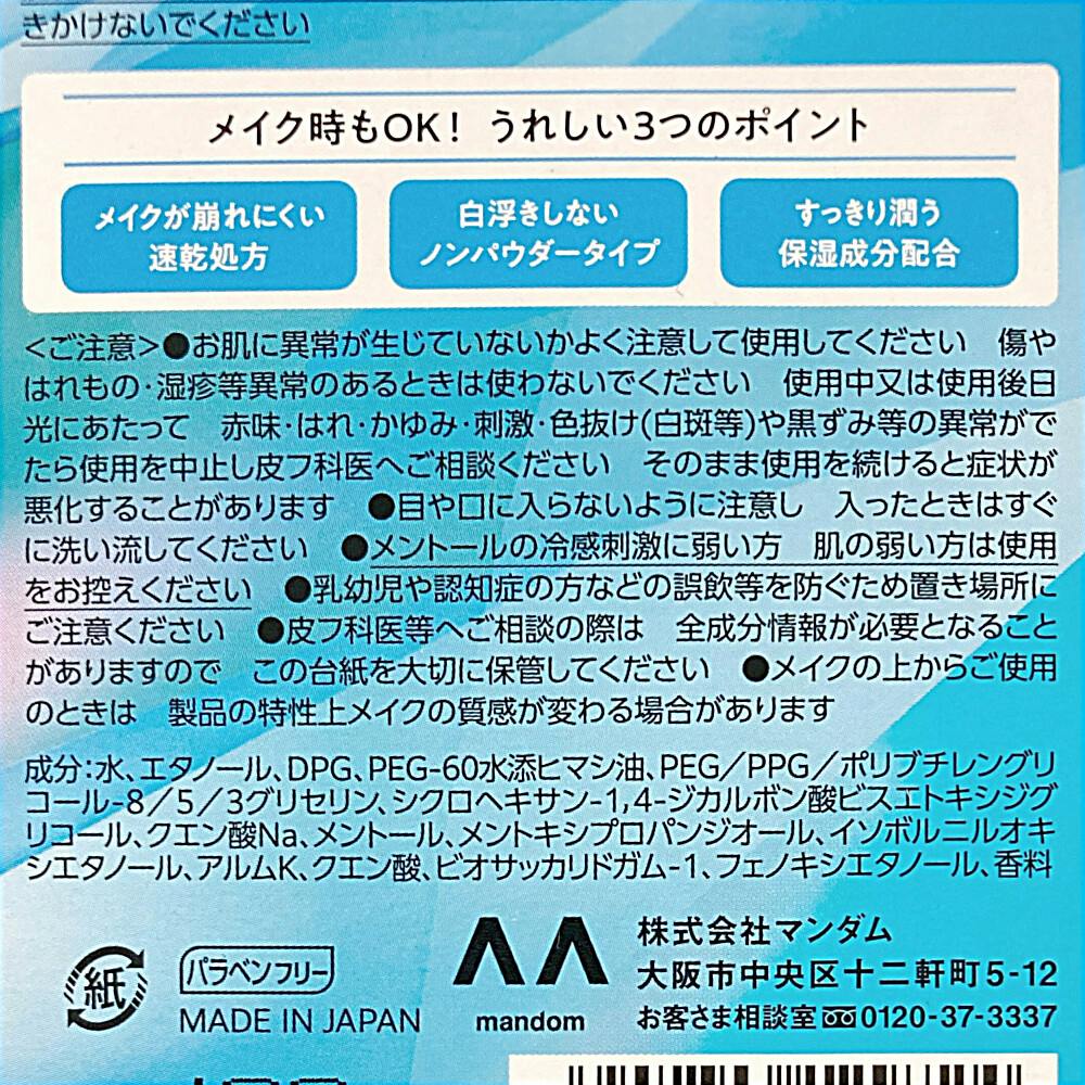 ●シュッとひとふき瞬間アイスダウン、汗ばむほてり顔もひんやり潤う/冷涼成分&保湿成分配合●こんなとき/暑い日の外出に。ハンディファンの前に使ってさらにひんやり気持ちいい●パラベンフリー