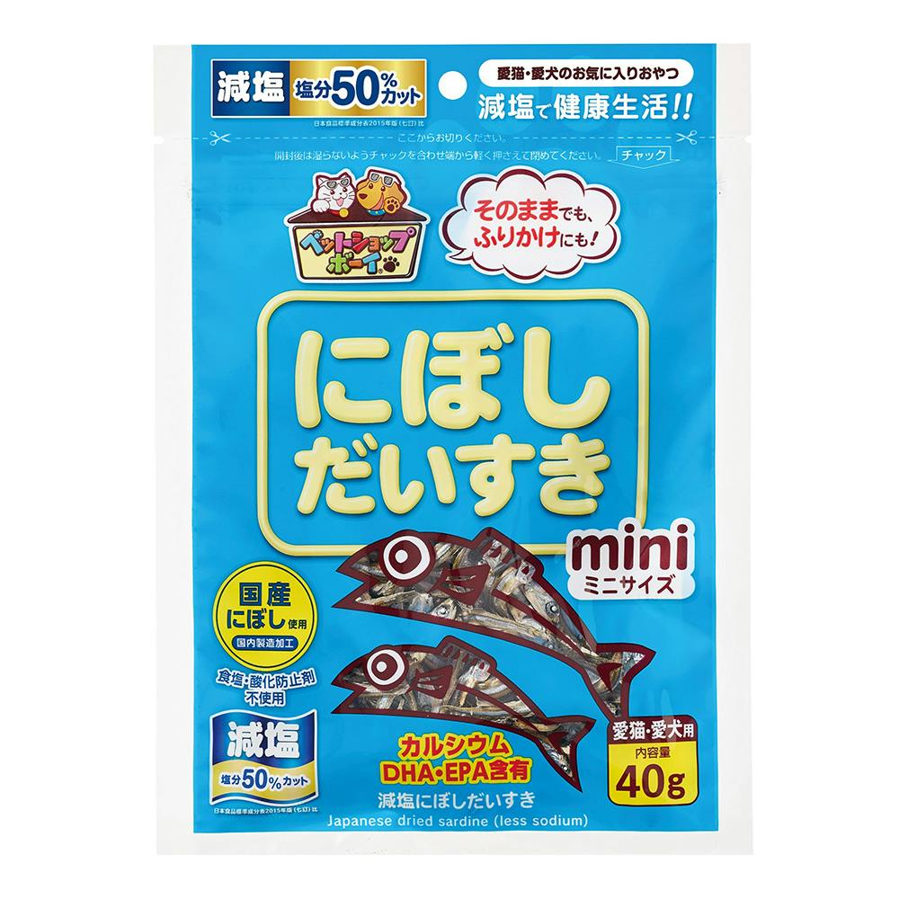 ペットフード(犬、猫用)の低塩分にぼし。一般品(七訂)比塩分約50%カット(塩分2%以下)。国内産にぼしだけを使用。にぼしに含まれるカルシウム、DHA、EPAをまるごと摂取可能。保存料、着色料不使用。脱酸素剤を封入し、品質劣化を防いでいます。