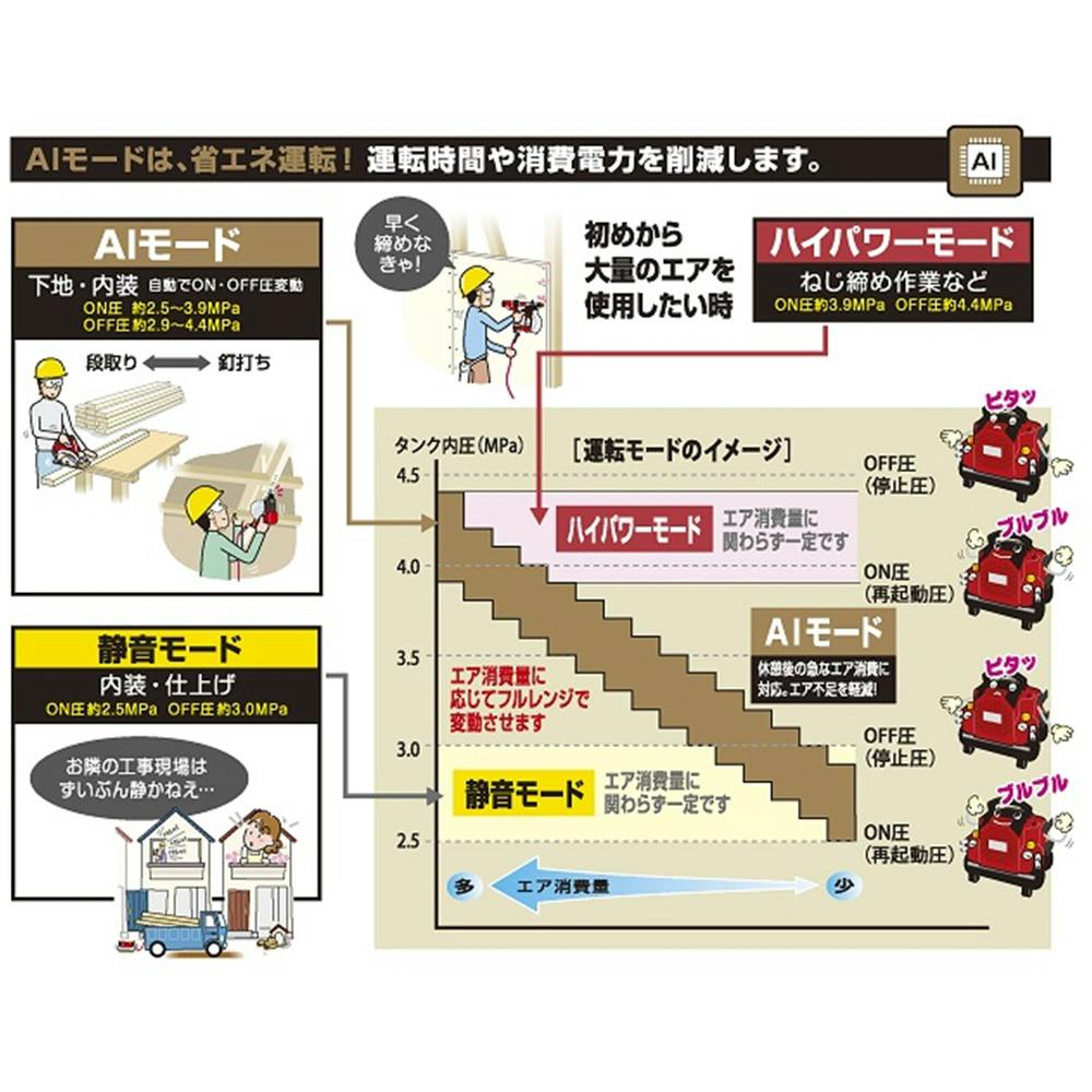 静音モードON圧 約2.5MPa OFF圧 約3.0MPa AIモードON圧 約2.5~3.9MPa OFF圧2.9MPa ハイパワーモードON圧 約3.9MPa OFF圧約4.4MPa