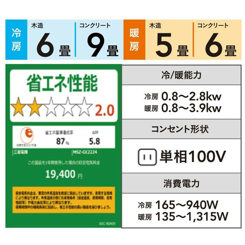 三菱電機 エアコン 霧ヶ峰 GEシリーズ 6畳用 MSZ-GE2224-W(販売終了)