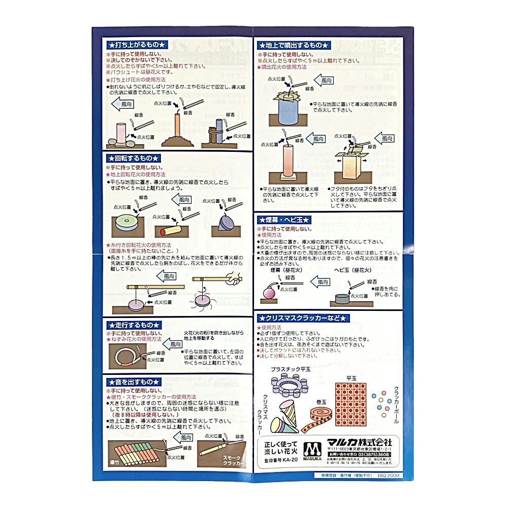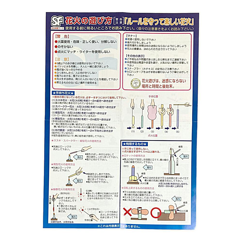 火薬が使用されています。花火を分解したりほぐしてはいけません。遊ぶ前に必ず消火用の水・バケツを十分用意して、必ず広い場所でお遊びください。人や家に向けたり、振り回してはいけません。