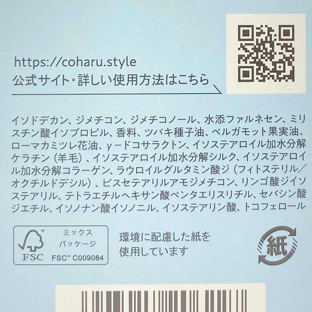 イソドデカン、ジメチコン、ジメチコノール、水添ファルネセン、ミリスチン酸イソプロピル、香料、ツバキ種子油、ベルガモット果実油、ローマカミツレ花油、y-ドコサラクトン、イソステアロイル加水分解ケラチン(羊毛)、イソステアロイル加水分解シルク、等