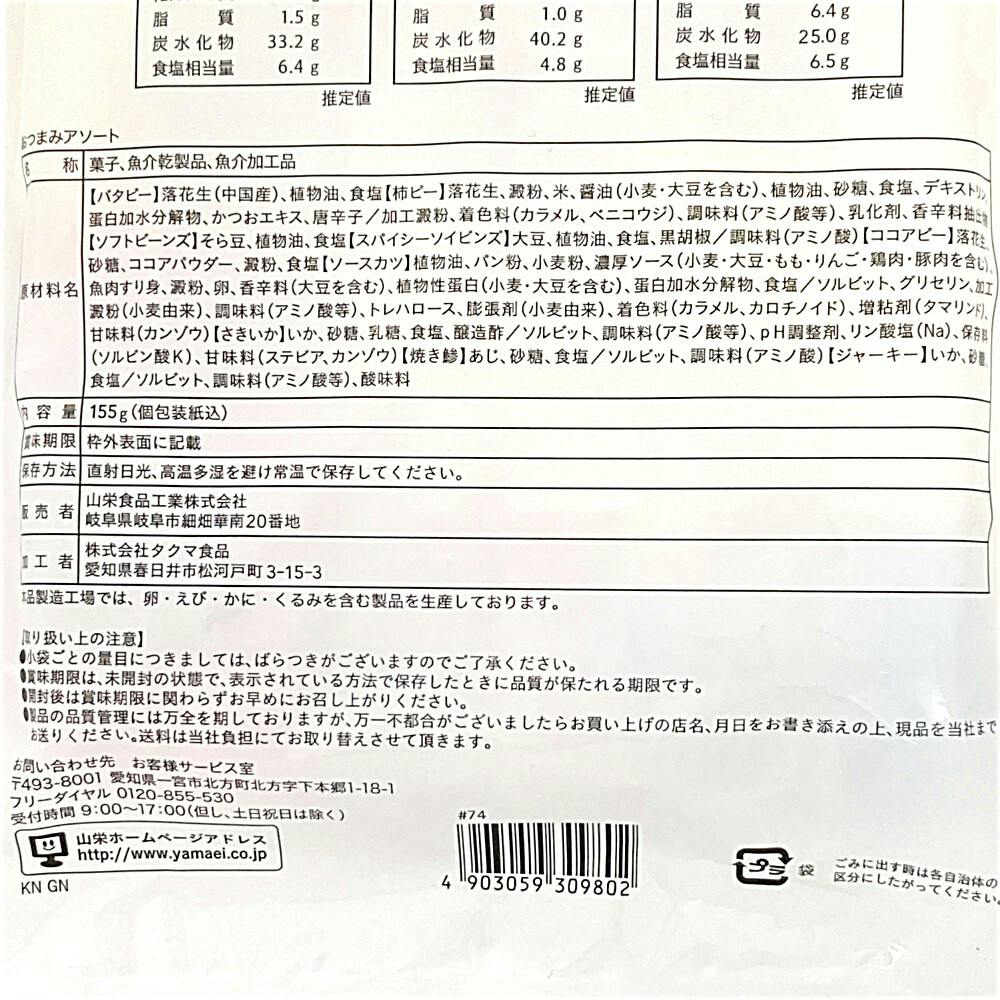 珍味や豆菓子を個包装にし詰め合わせました。