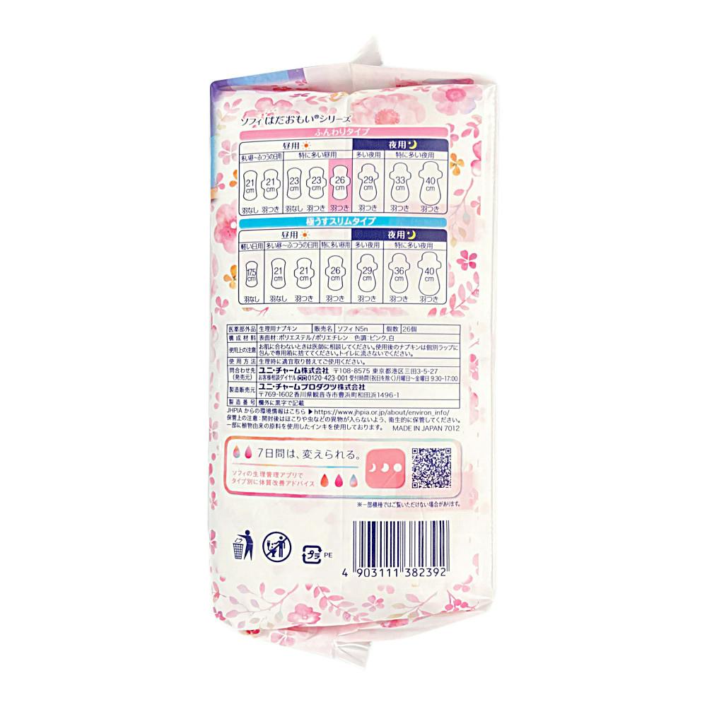 ●ソフィはだおもいは、長時間吸収力が持続して、交換まですっぴんのような肌のサラサラ感がつづくから、肌にやさしいです。●裏面は、ナチュラルフラワーデザイン●低刺激ふんわり立体ギャザー搭載