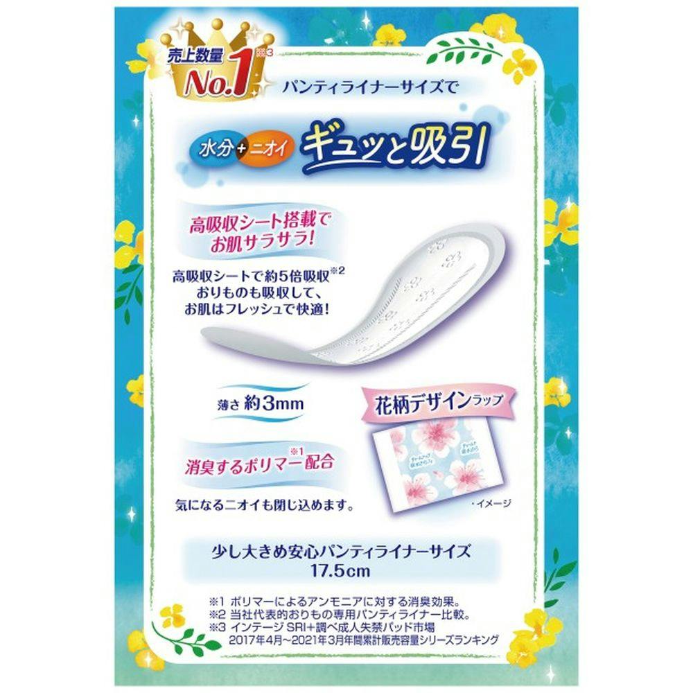 ●おりもの&水分ケア。さっぱり感つづく。●高吸収シート搭載でお肌サラサラ。高吸収シートで約5倍吸収。おりものも吸収して、お肌はフレッシュで快適。●消臭するポリマー配合。気になるニオイも閉じ込めます。