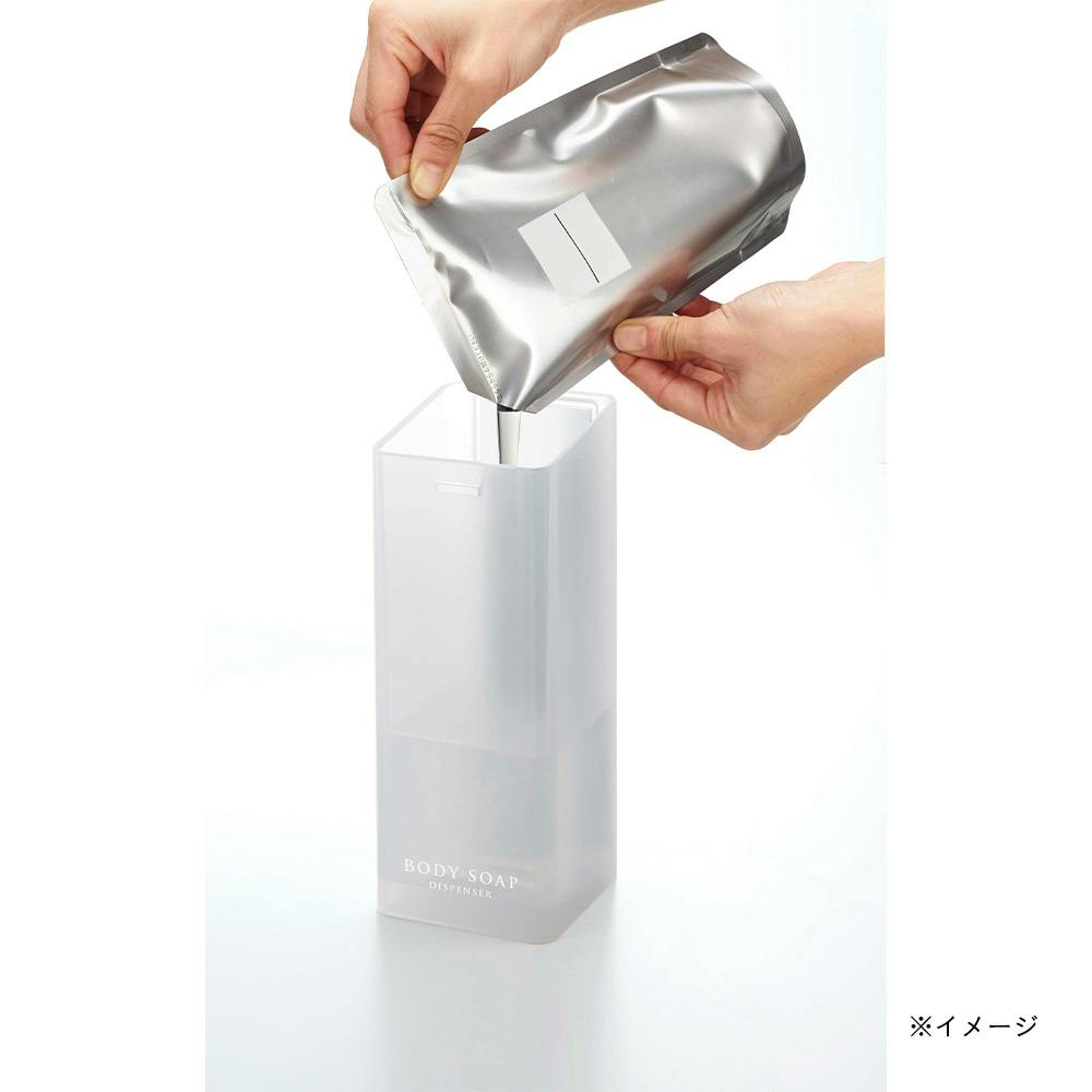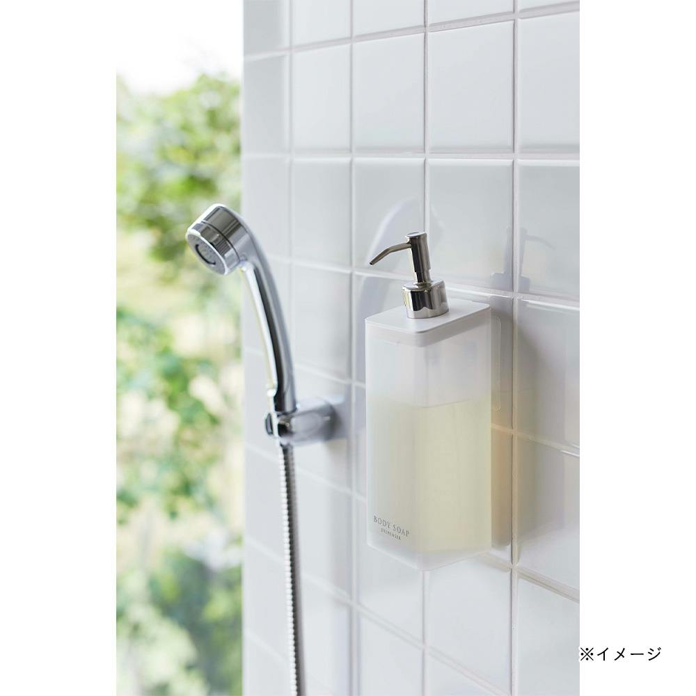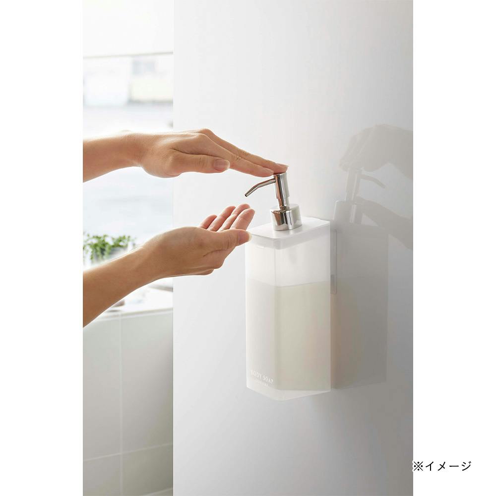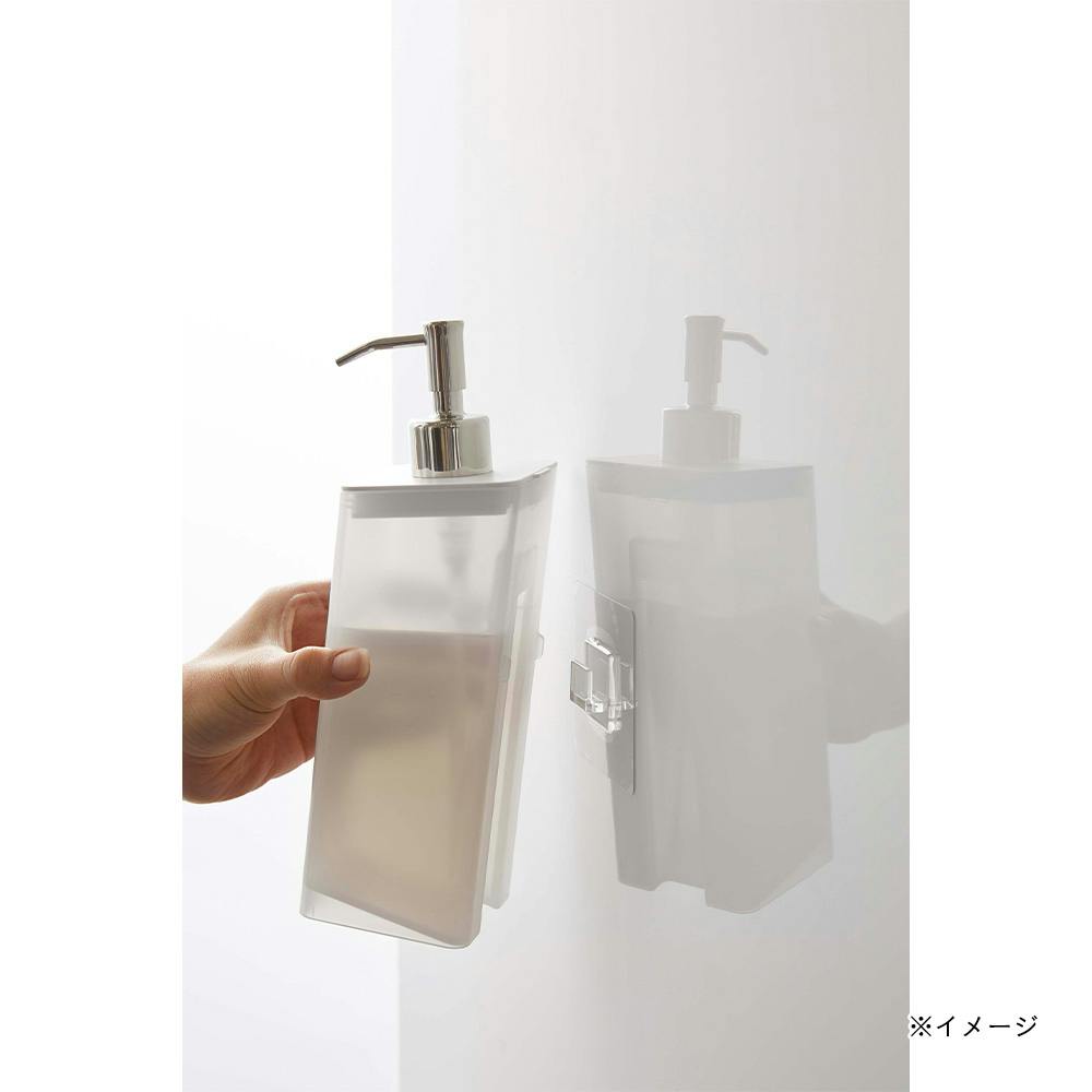 フィルムフックで壁面に浮かせて収納できるから、底がぬめらず衛生的。そのままポンプも押せます。壁面のフックにかけるだけ。そのままポンプも押せます。蓋が外れるので、詰め替えが簡単。詰め替え用袋がそのまま入ります。