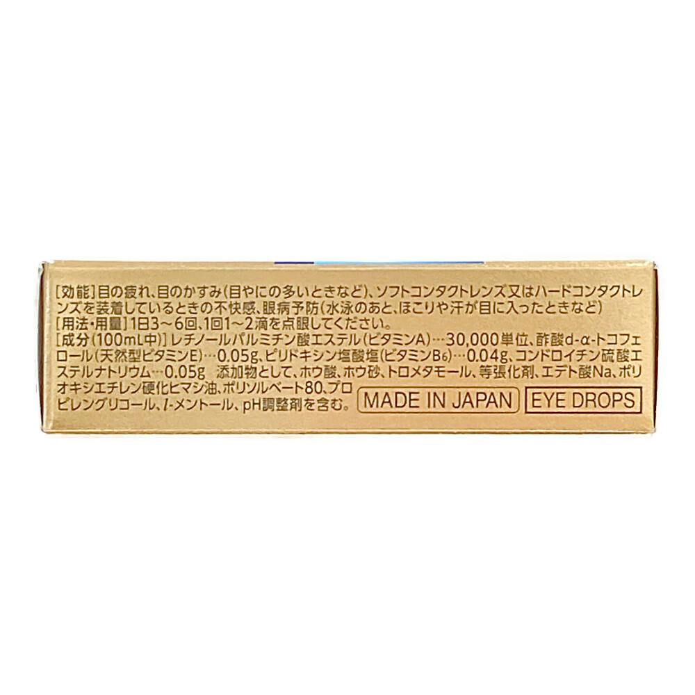 ●100mL中/レチノールパルミチン酸エステル(ビタミンA):30,000単位、酢酸d-α-トコフェロール(天然型ビタミンE):0.05g、ピリドキシン塩酸塩(ビタミンB6):0.04g、 コンドロイチン硫酸エ ステルナトリウム:0.05g●添加物/ホウ酸、ホウ砂、トロメタモール、等張化剤、等