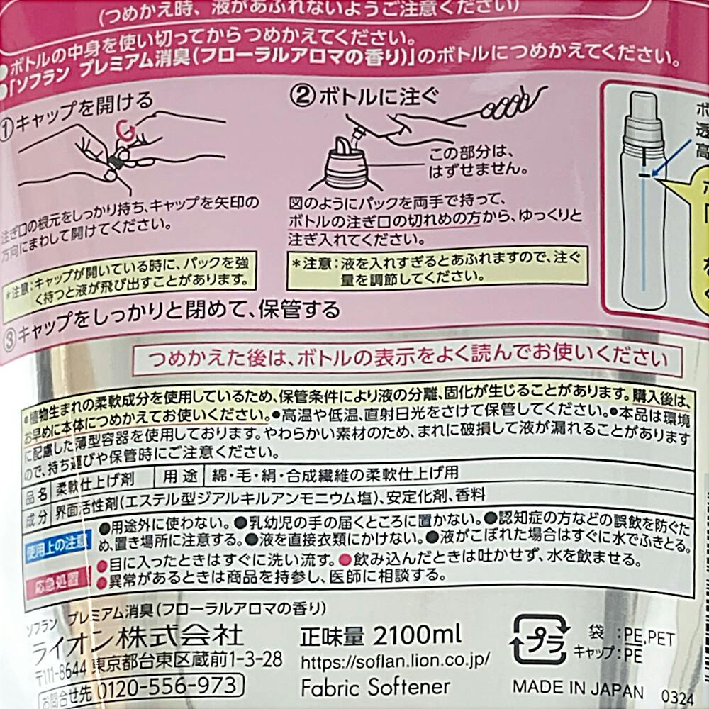 ●ボトルの中身を使い切ってからつめかえてください。●「ソフラン プレミアム消臭(フローラルアロマの香り)」のボトルにつめかえてください。1.キャップを開ける。2.ボトルに注ぐ。3.キャップをしっかりと閉めて、保管する。